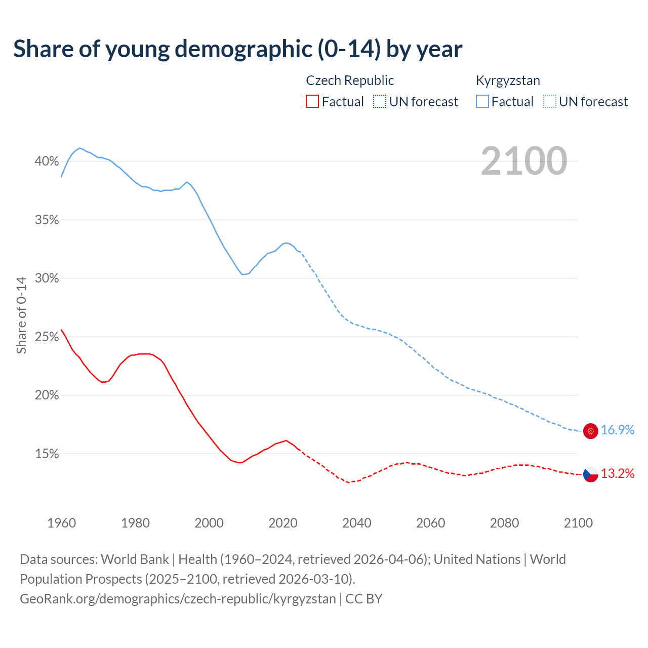 - The share of young demographic (0-15 years old) in the Czech Republic is 15.4% vs 32.3% in Kyrgyzstan.