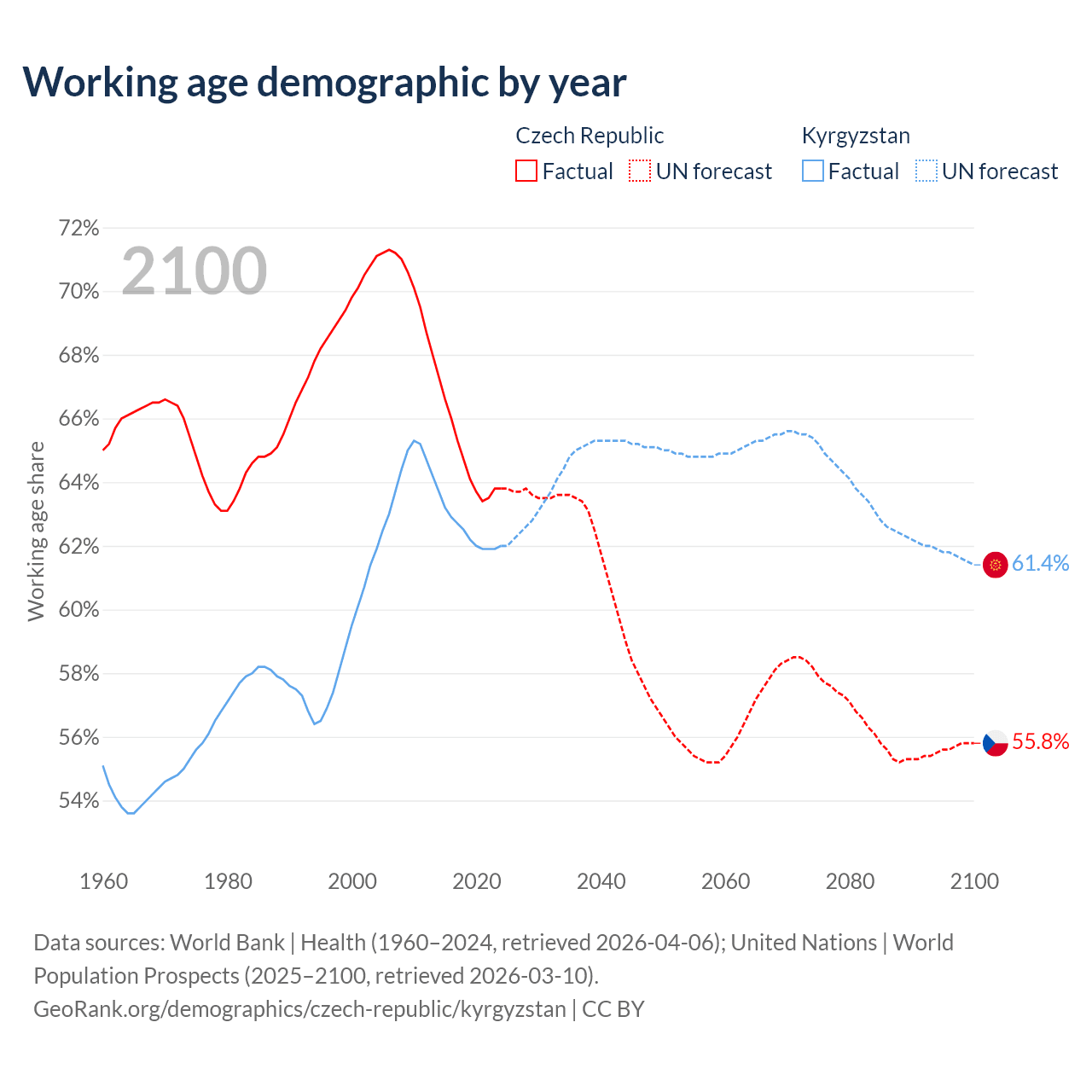 - The Czech Republic has 6.79M working age adults (aged 15-64) vs 4.63M in Kyrgyzstan.