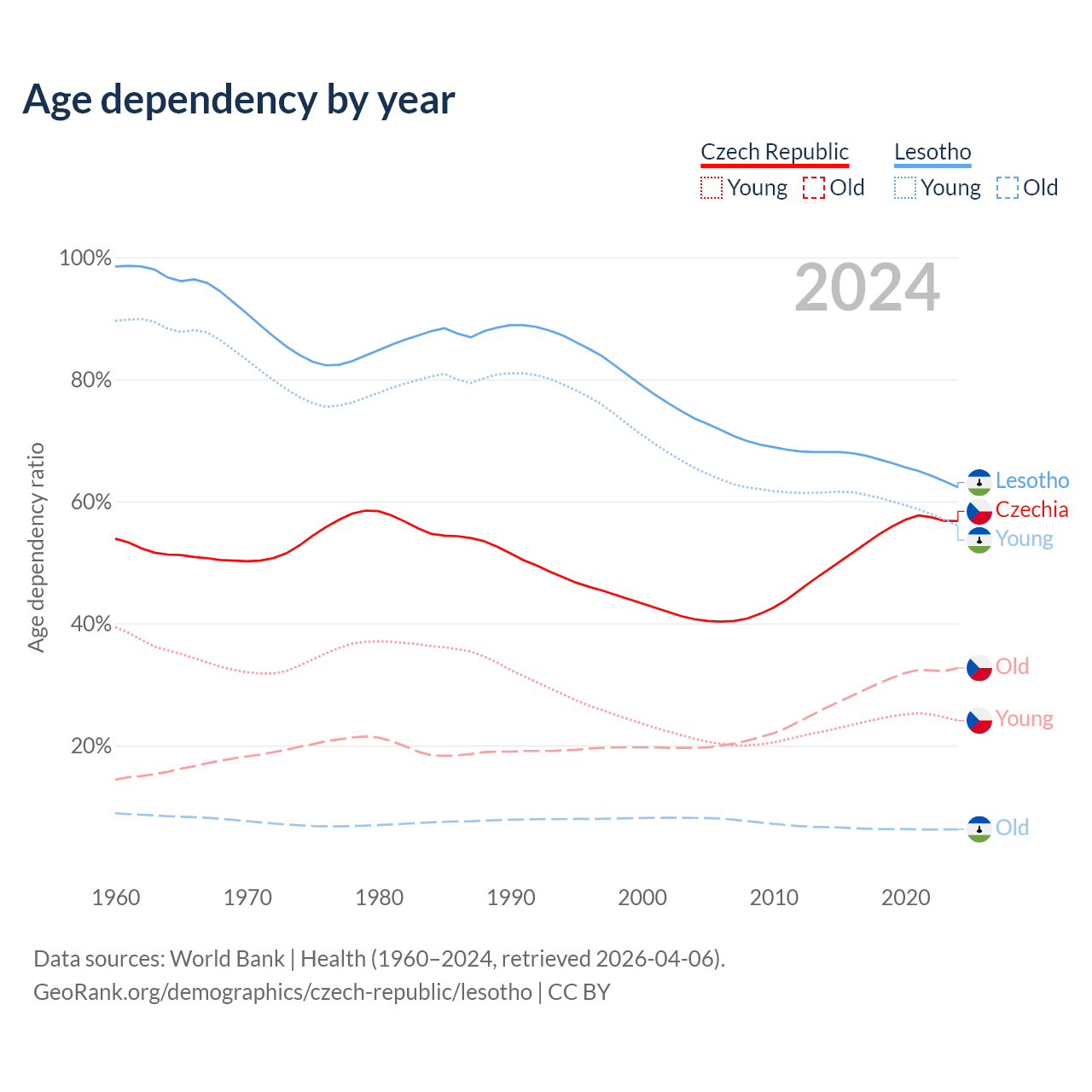 - The share of old-age demographic (65+) in the Czech Republic is 20.8% vs 3.86% in Lesotho.