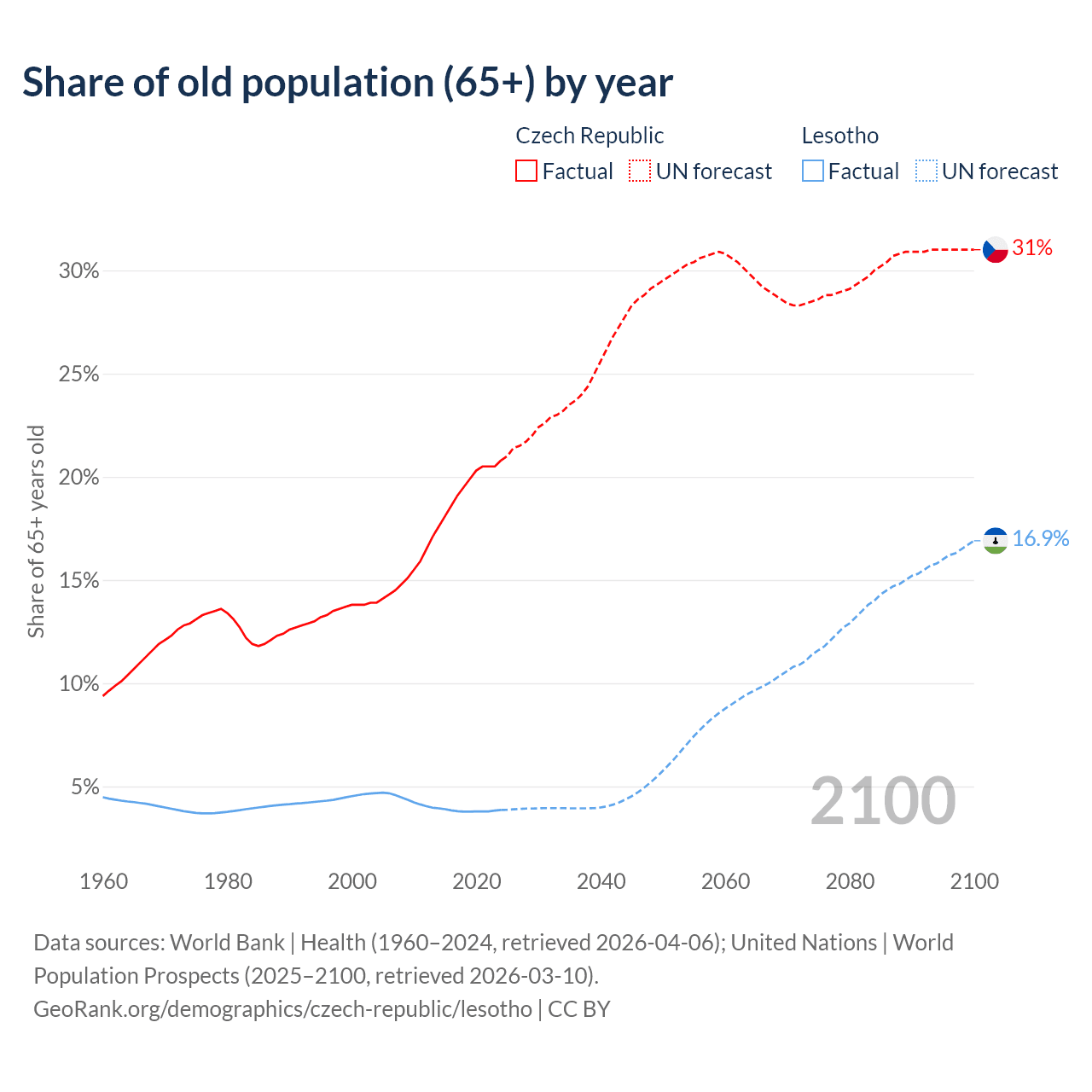 The share of older people aged 65 and over is 20.8% in the Czech Republic and 3.86% in Lesotho. Life expectancy in the Czech Republic compared to Lesotho .