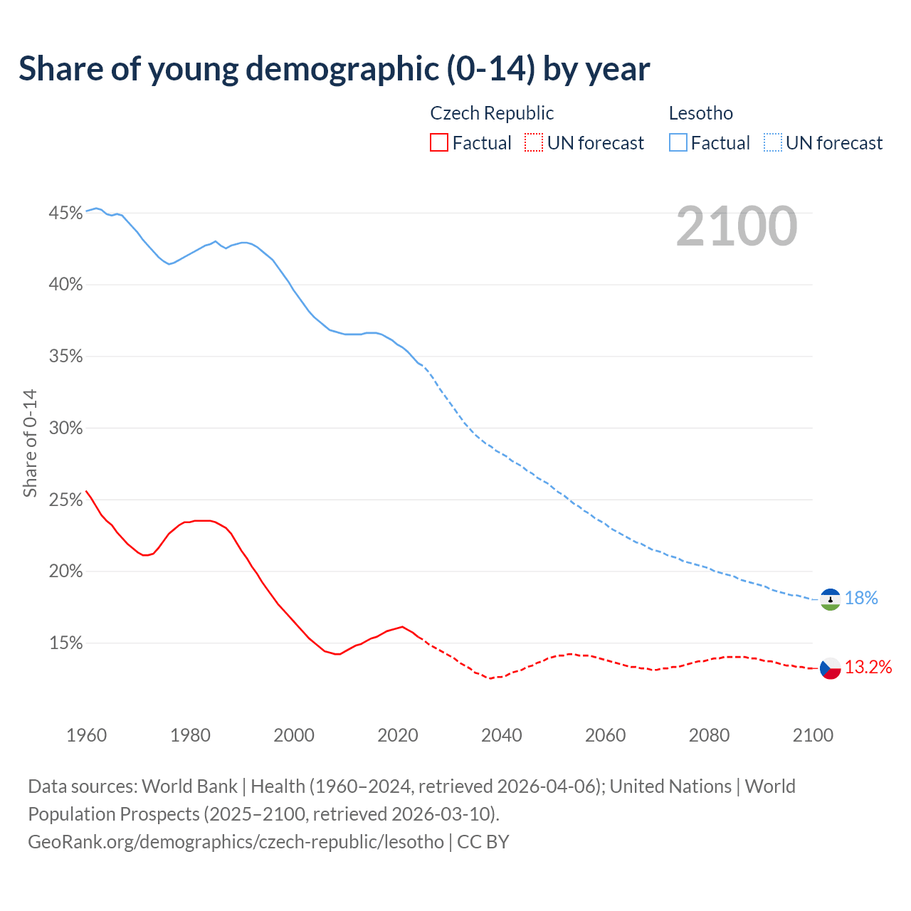 - The share of young demographic (0-15 years old) in the Czech Republic is 15.4% vs 34.5% in Lesotho.