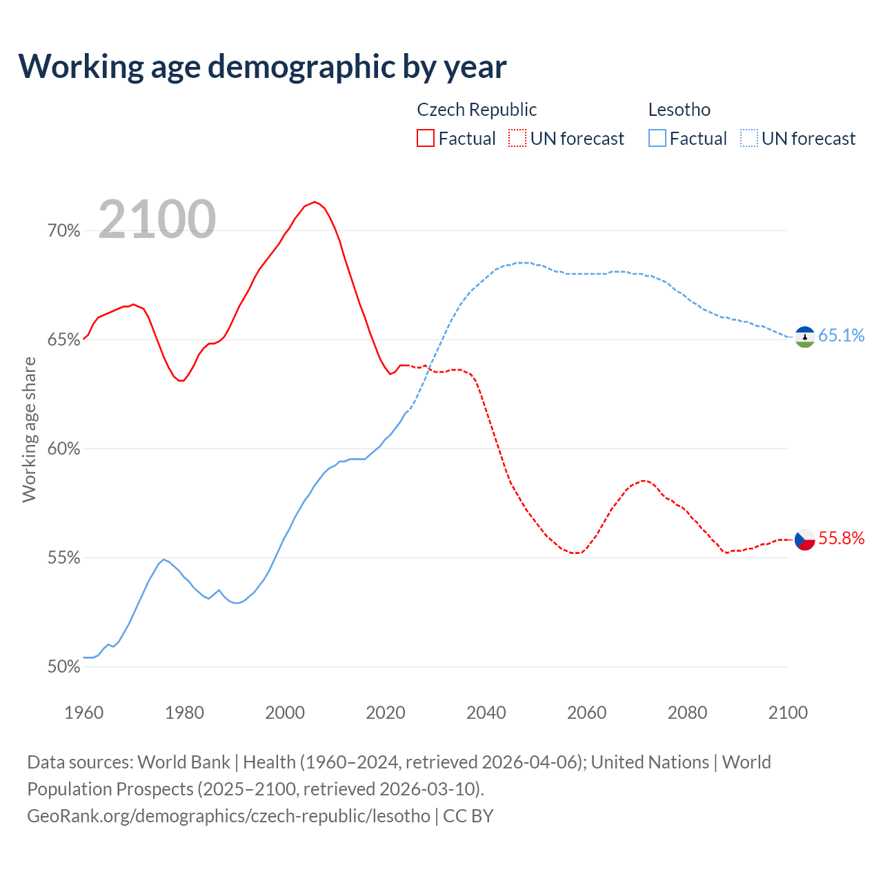 - The Czech Republic has 6.79M working age adults (aged 15-64) vs 1.48M in Lesotho.