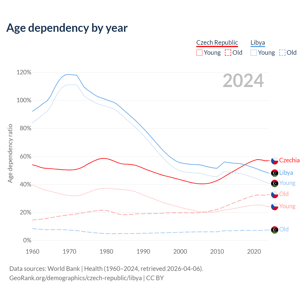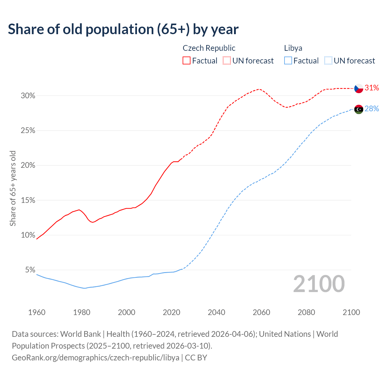 - The share of old-age demographic (65+) in the Czech Republic is 20.8% vs 5.02% in Libya.