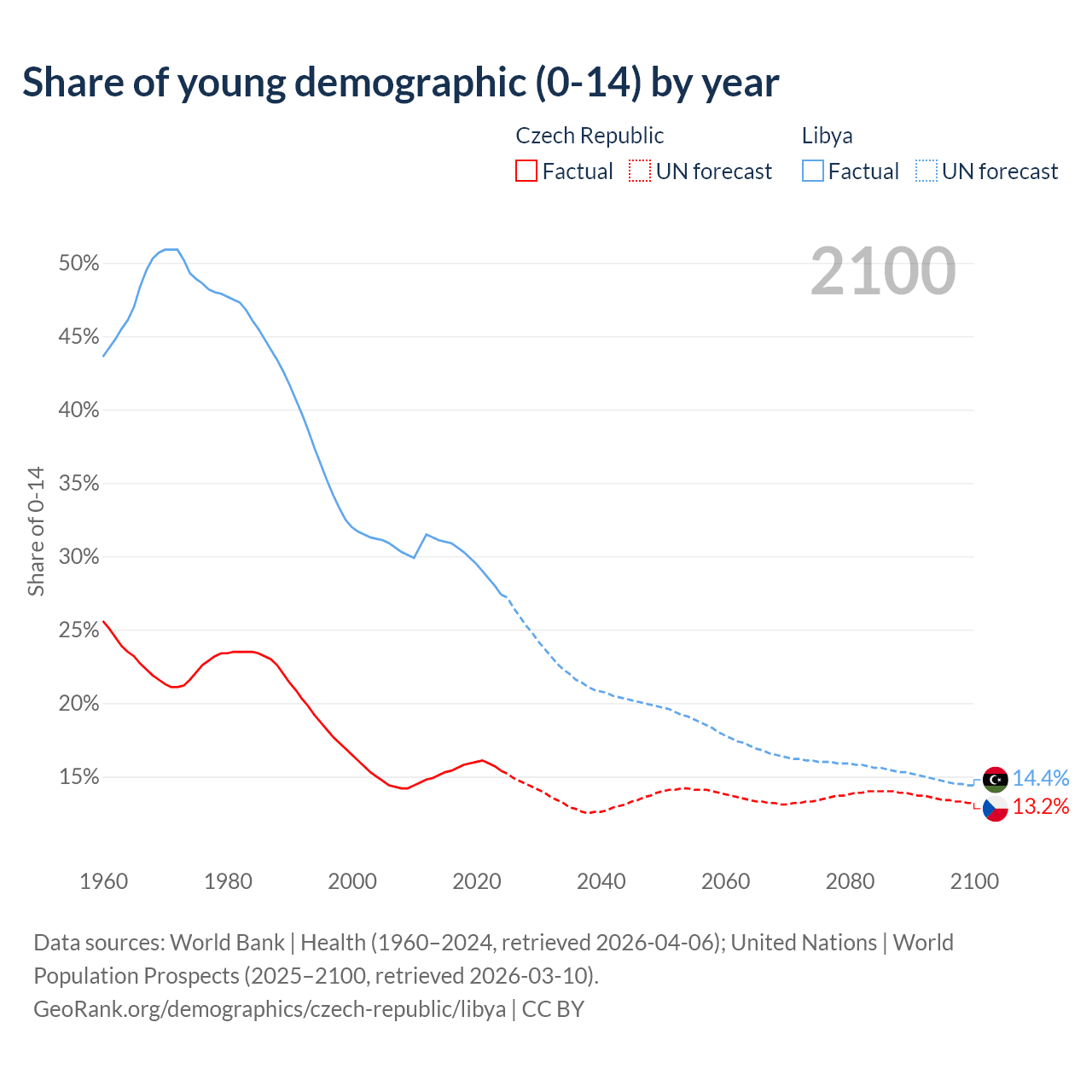 - The share of young demographic (0-15 years old) in the Czech Republic is 15.4% vs 27.4% in Libya.