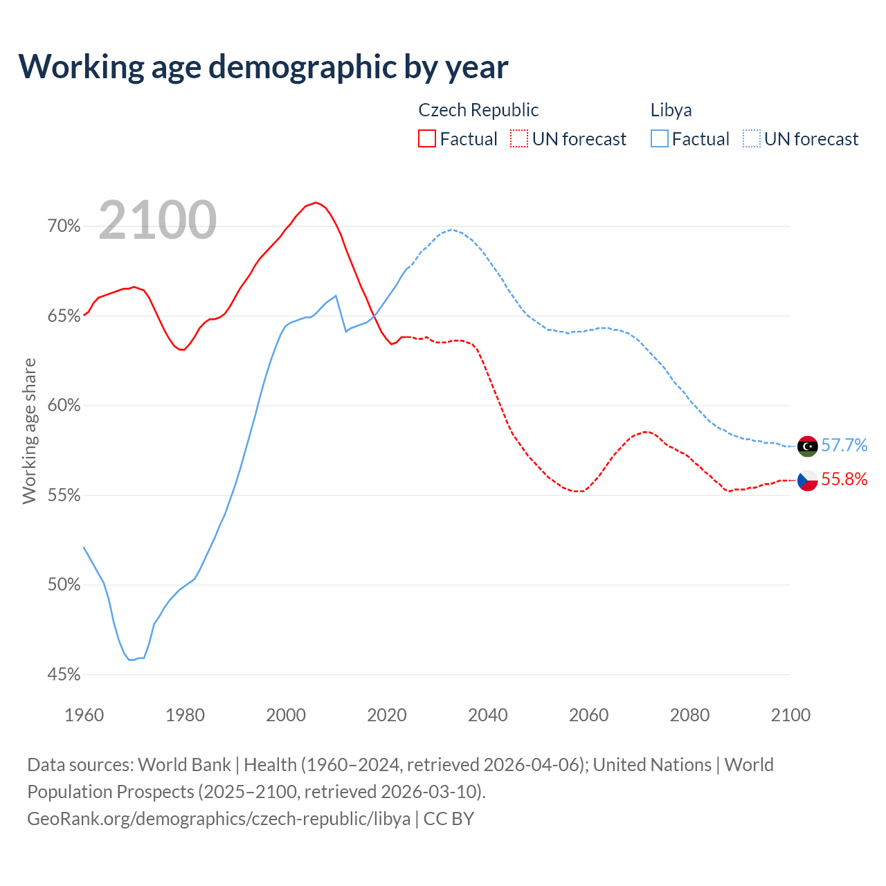 - The Czech Republic has 6.79M working age adults (aged 15-64) vs 5.11M in Libya.