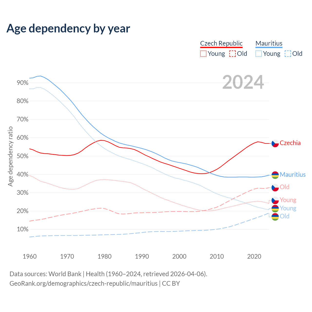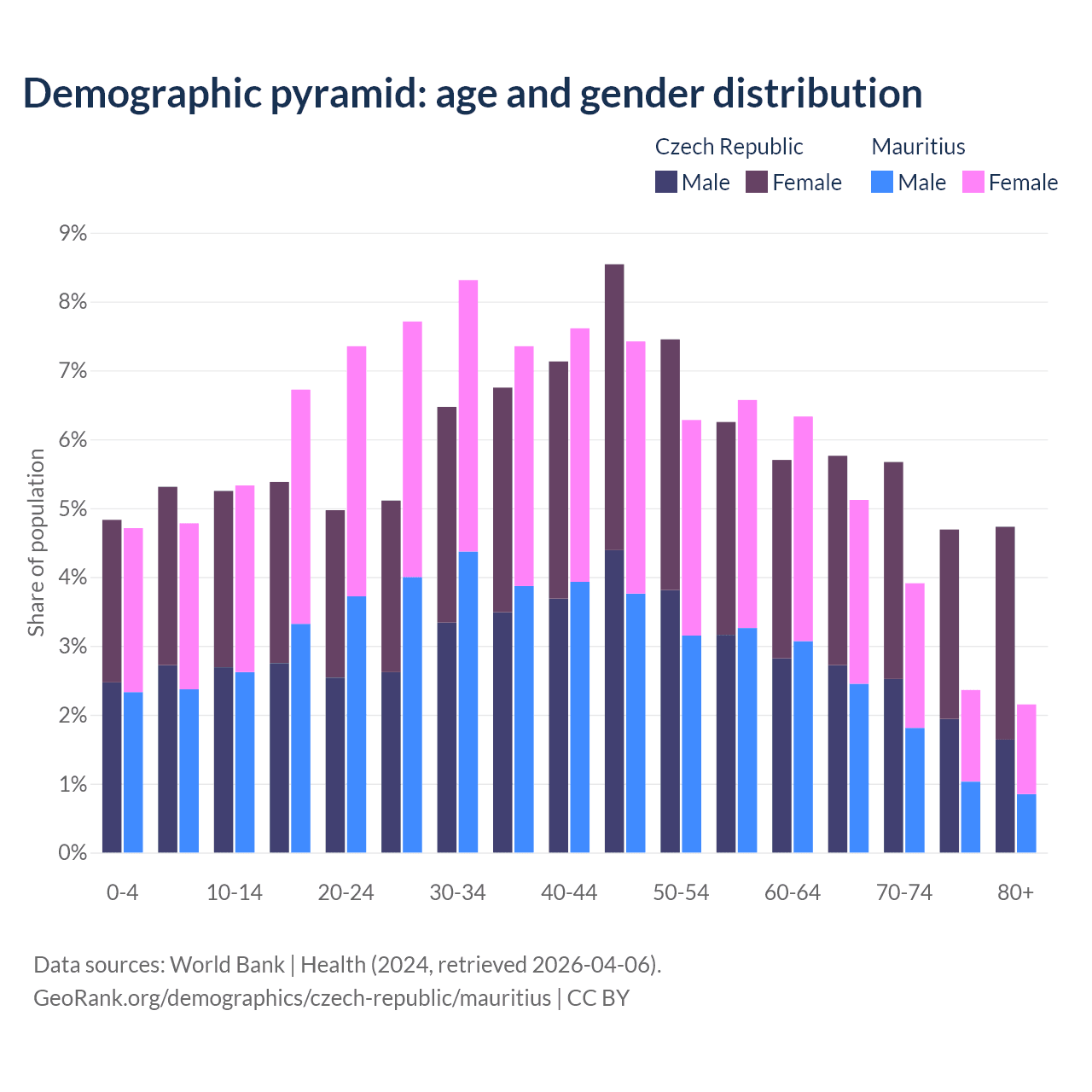 - The Czech Republic is ranked 21/196 by median age (oldest to youngest) vs 57/196 for Mauritius.