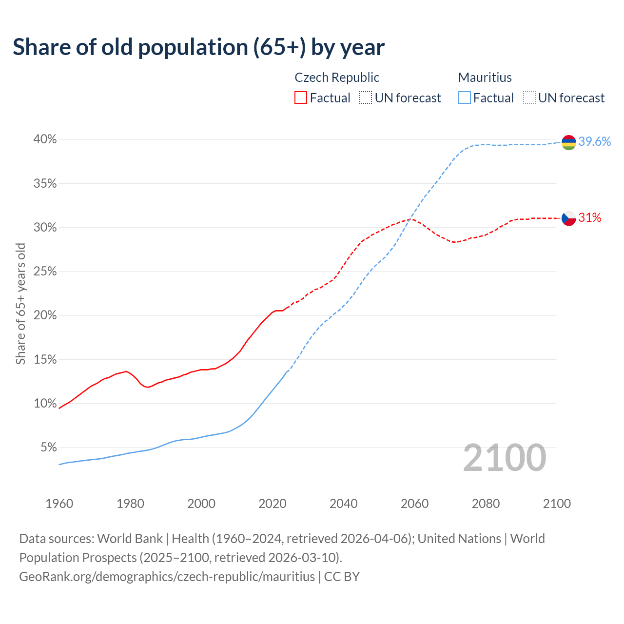 The share of older people aged 65 and over is 20.8% in the Czech Republic and 13.5% in Mauritius. Life expectancy in the Czech Republic compared to Mauritius .