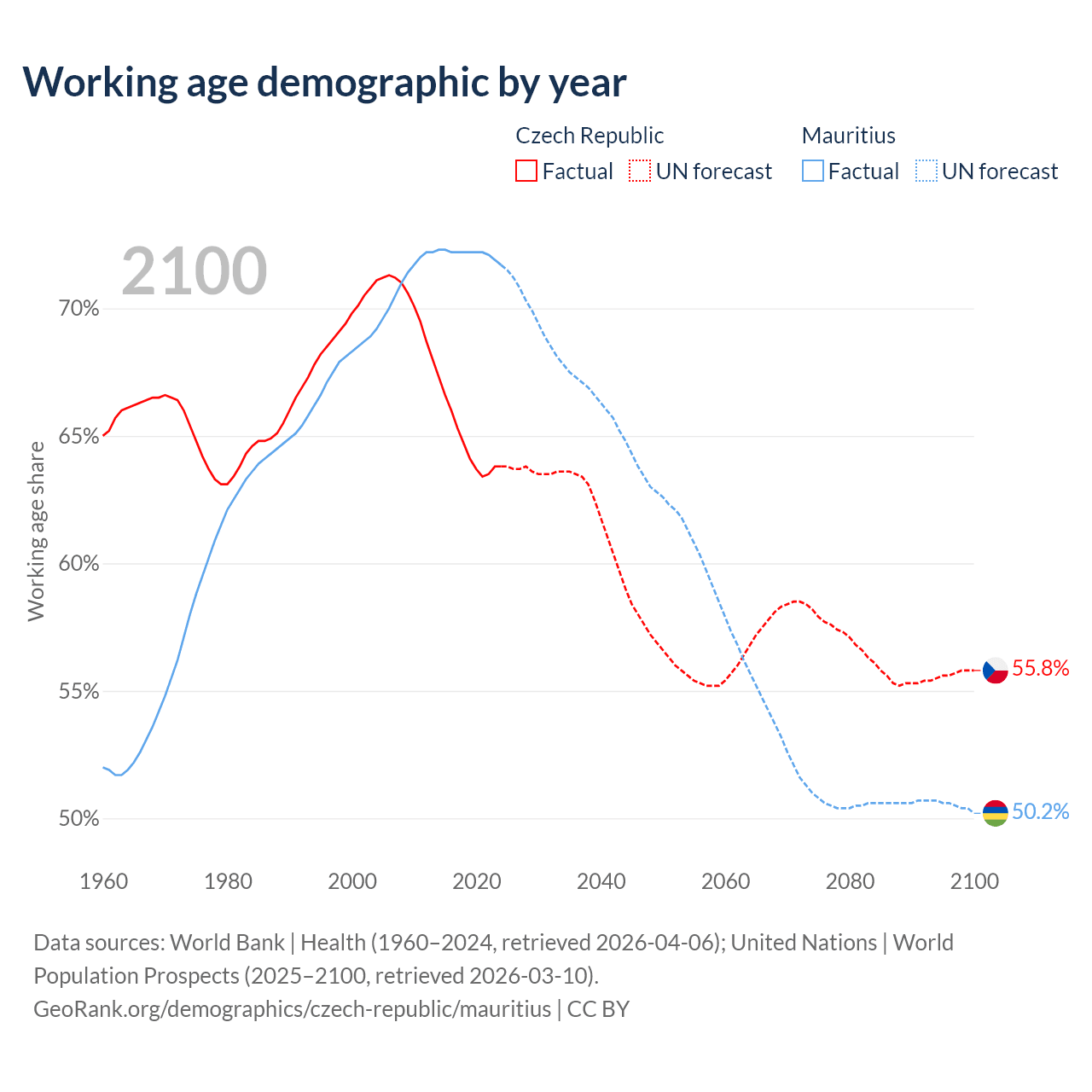 - The Czech Republic has 6.79M working age adults (aged 15-64) vs 889K in Mauritius.