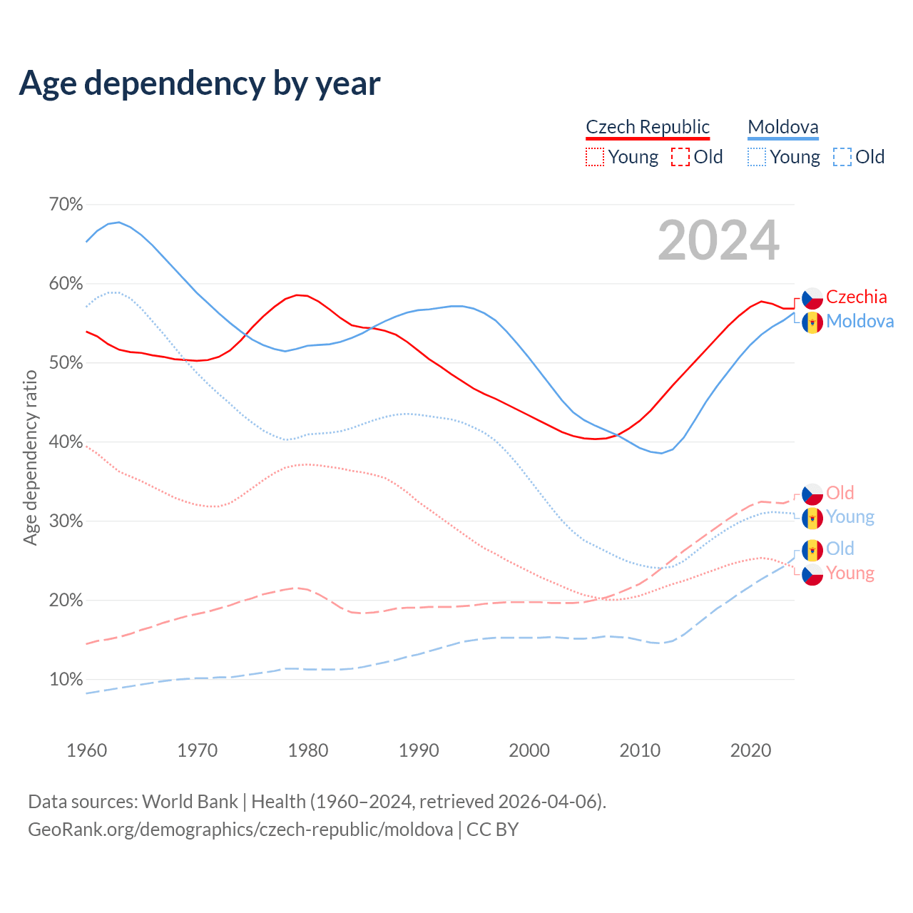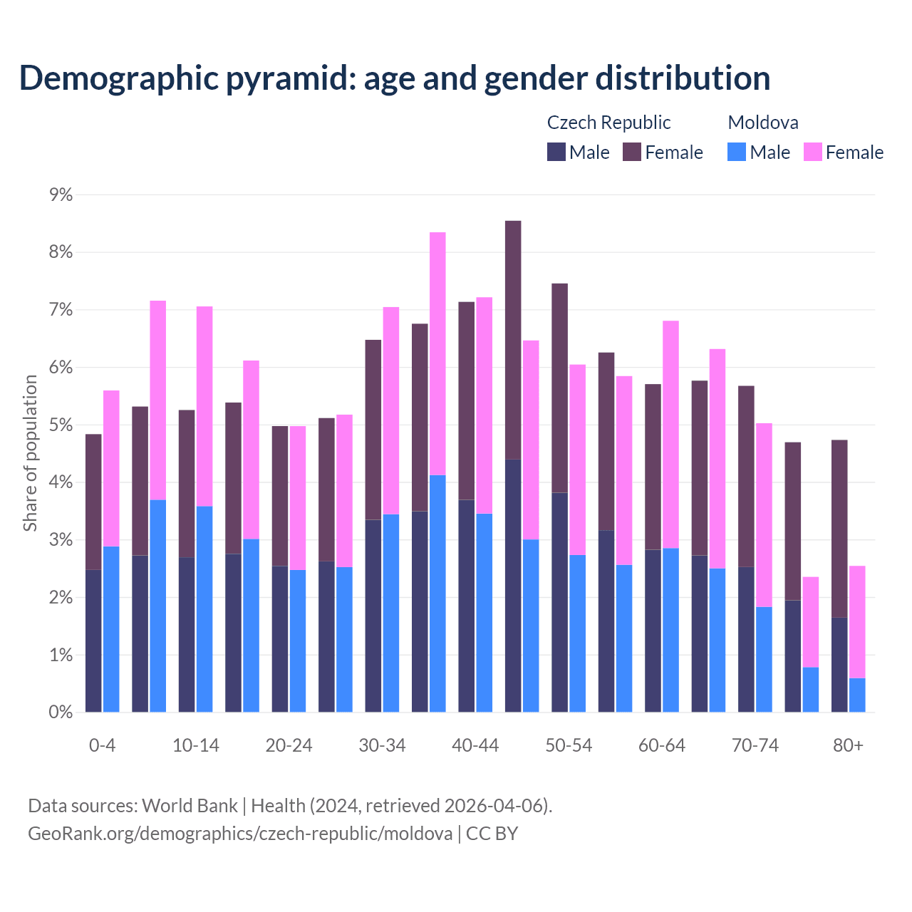 - The Czech Republic is ranked 21/196 by median age (oldest to youngest) vs 54/196 for Moldova.