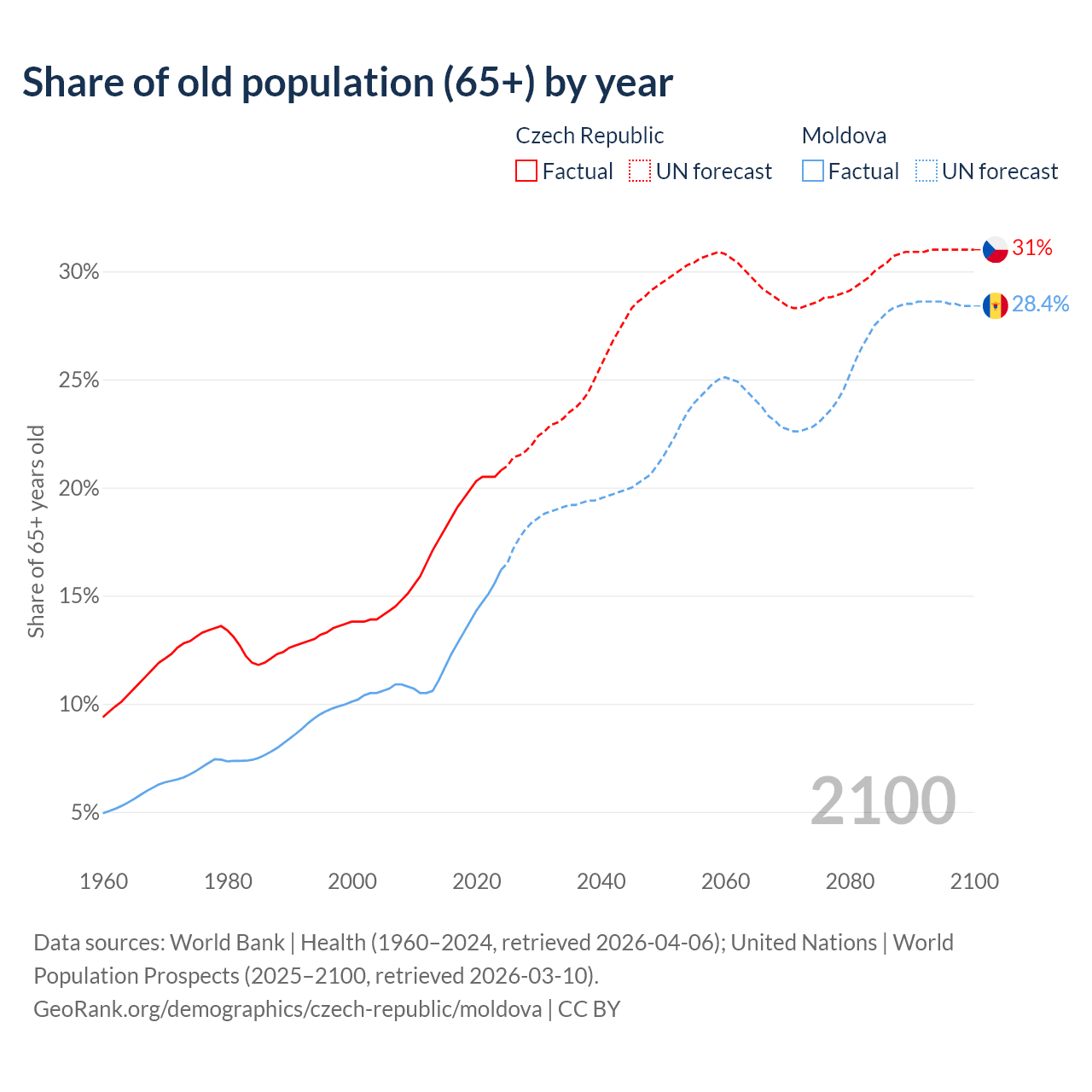 The share of older people aged 65 and over is 20.8% in the Czech Republic and 16.2% in Moldova. Life expectancy in the Czech Republic compared to Moldova .