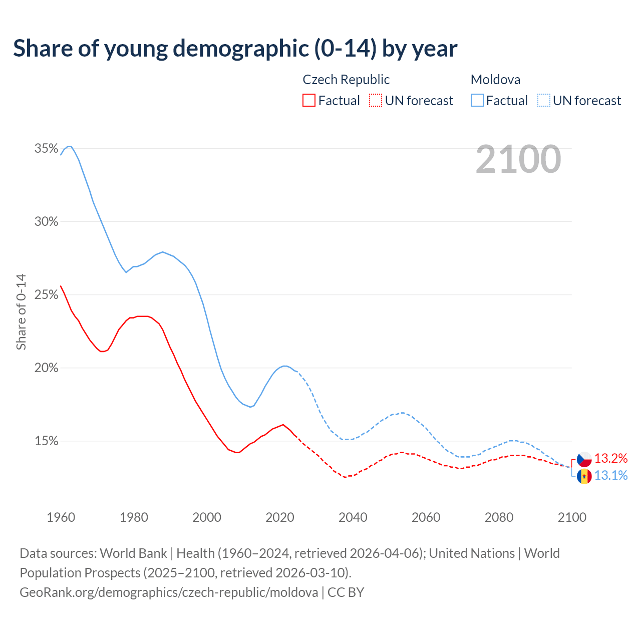 - The share of young demographic (0-15 years old) in the Czech Republic is 15.4% vs 19.8% in Moldova.