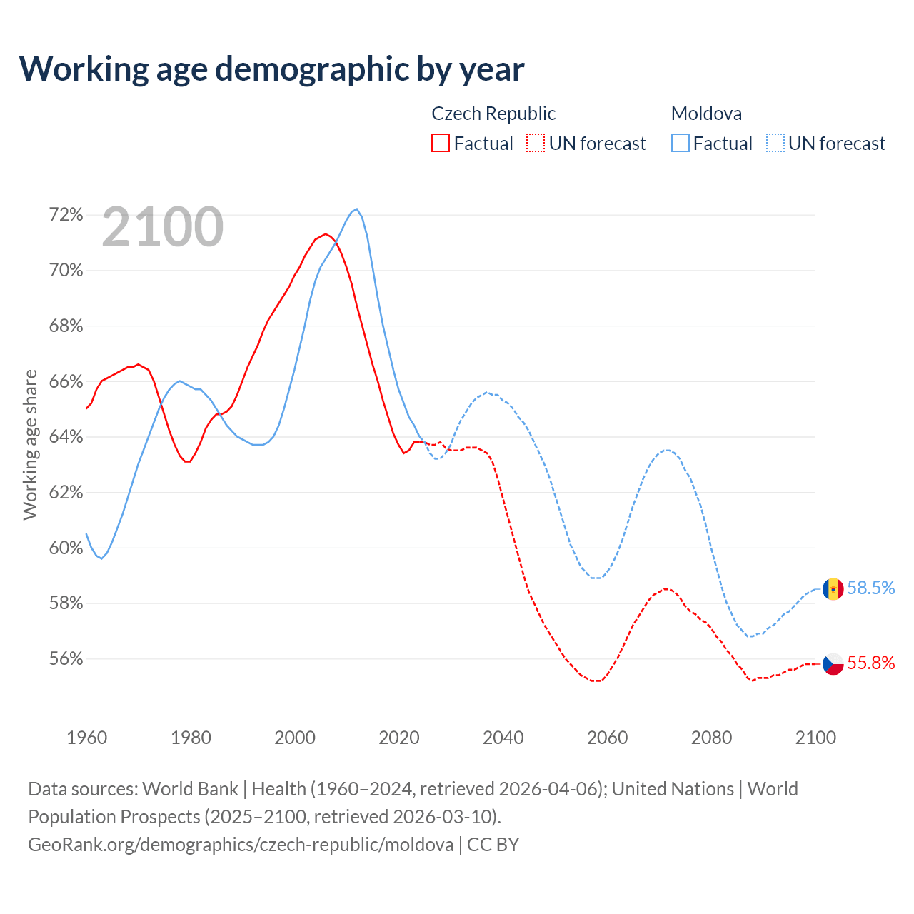 Median age Czech Republic vs Moldova, 1960-2100