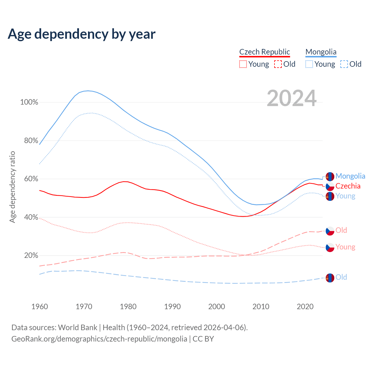 - The Czech Republic is ranked 21/196 by median age (oldest to youngest) vs 117/196 for Mongolia.