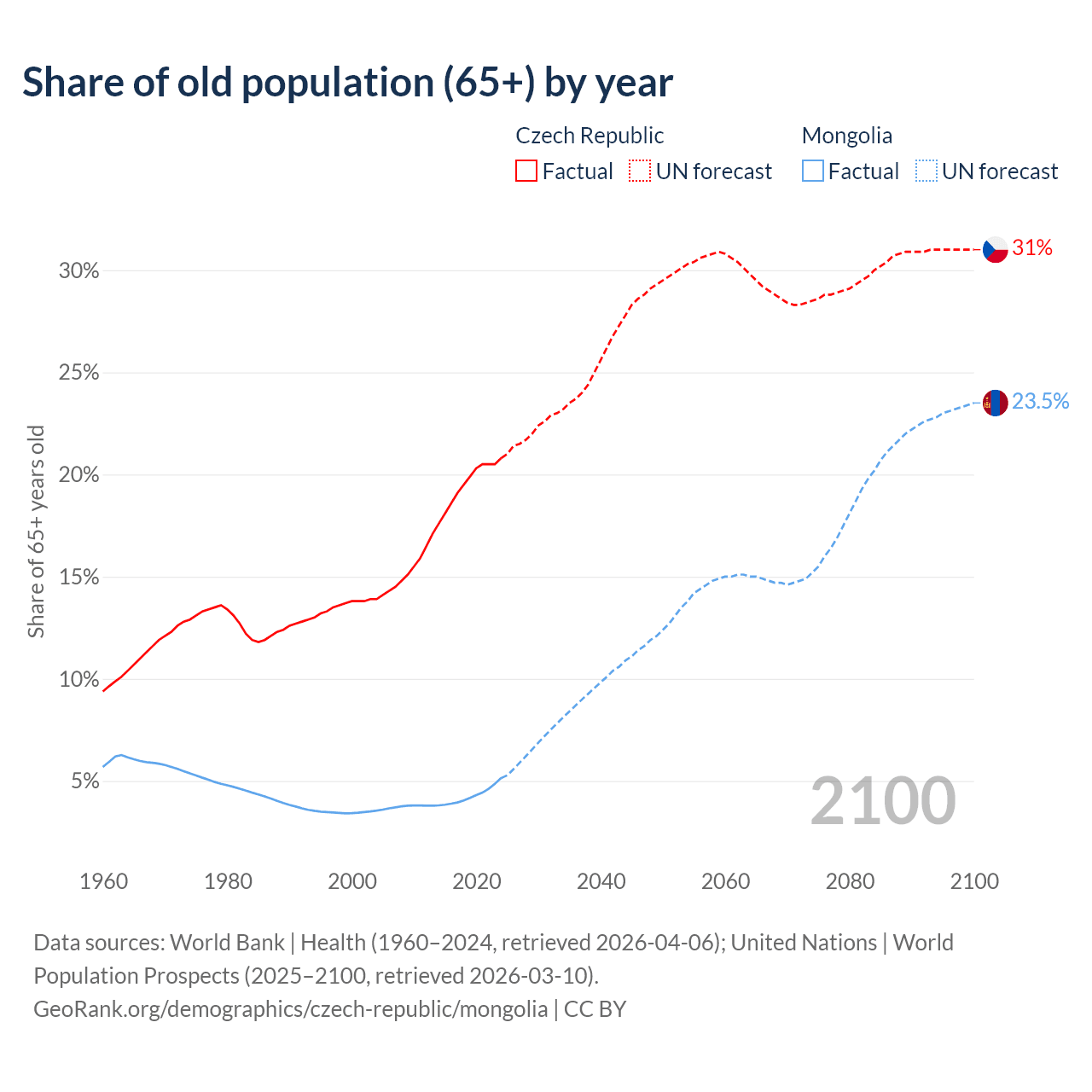 The share of older people aged 65 and over is 20.8% in the Czech Republic and 5.14% in Mongolia. Life expectancy in the Czech Republic compared to Mongolia .