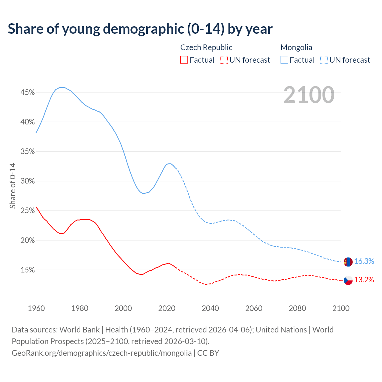 - The share of young demographic (0-15 years old) in the Czech Republic is 15.4% vs 32.2% in Mongolia.