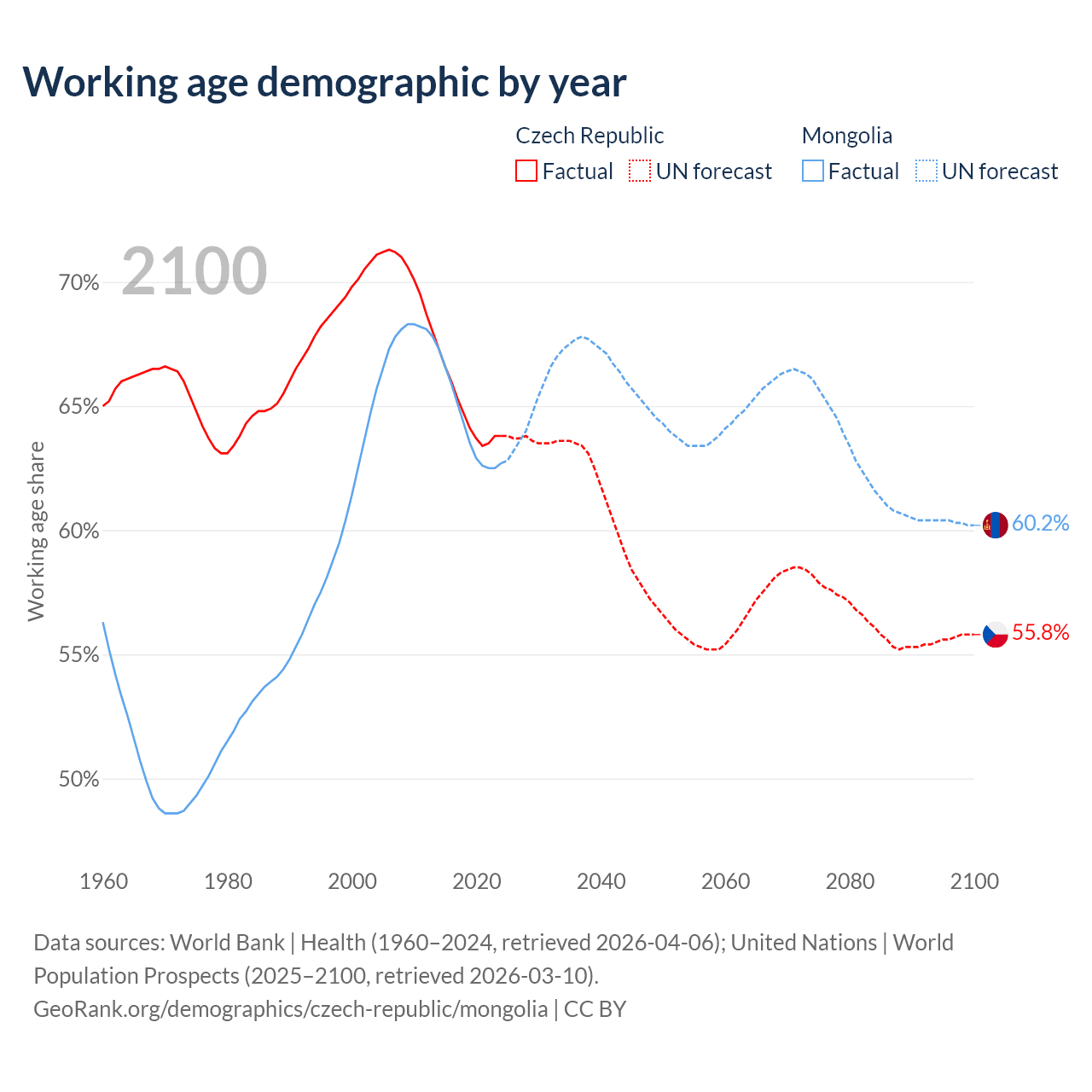 - The Czech Republic has 6.79M working age adults (aged 15-64) vs 2.27M in Mongolia.