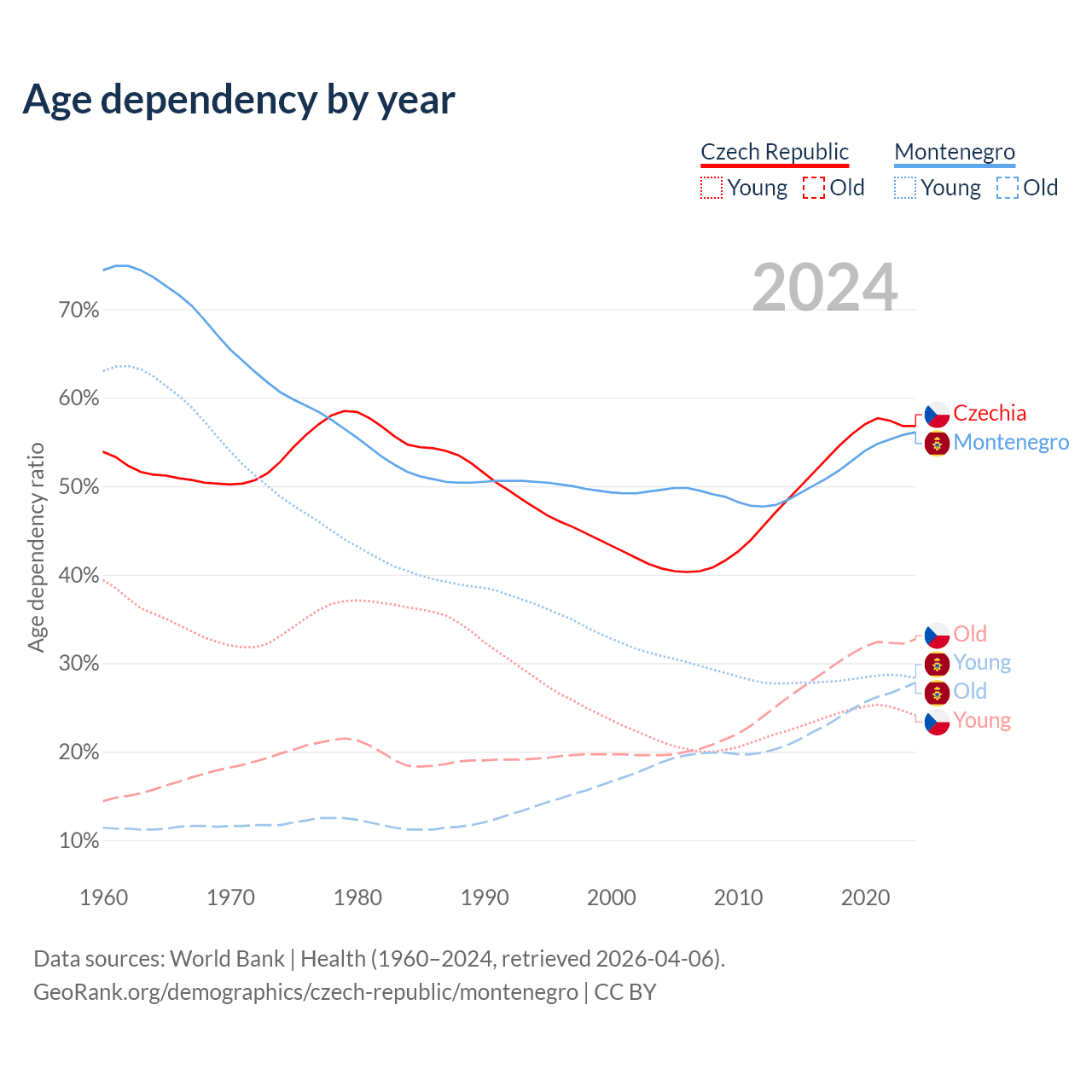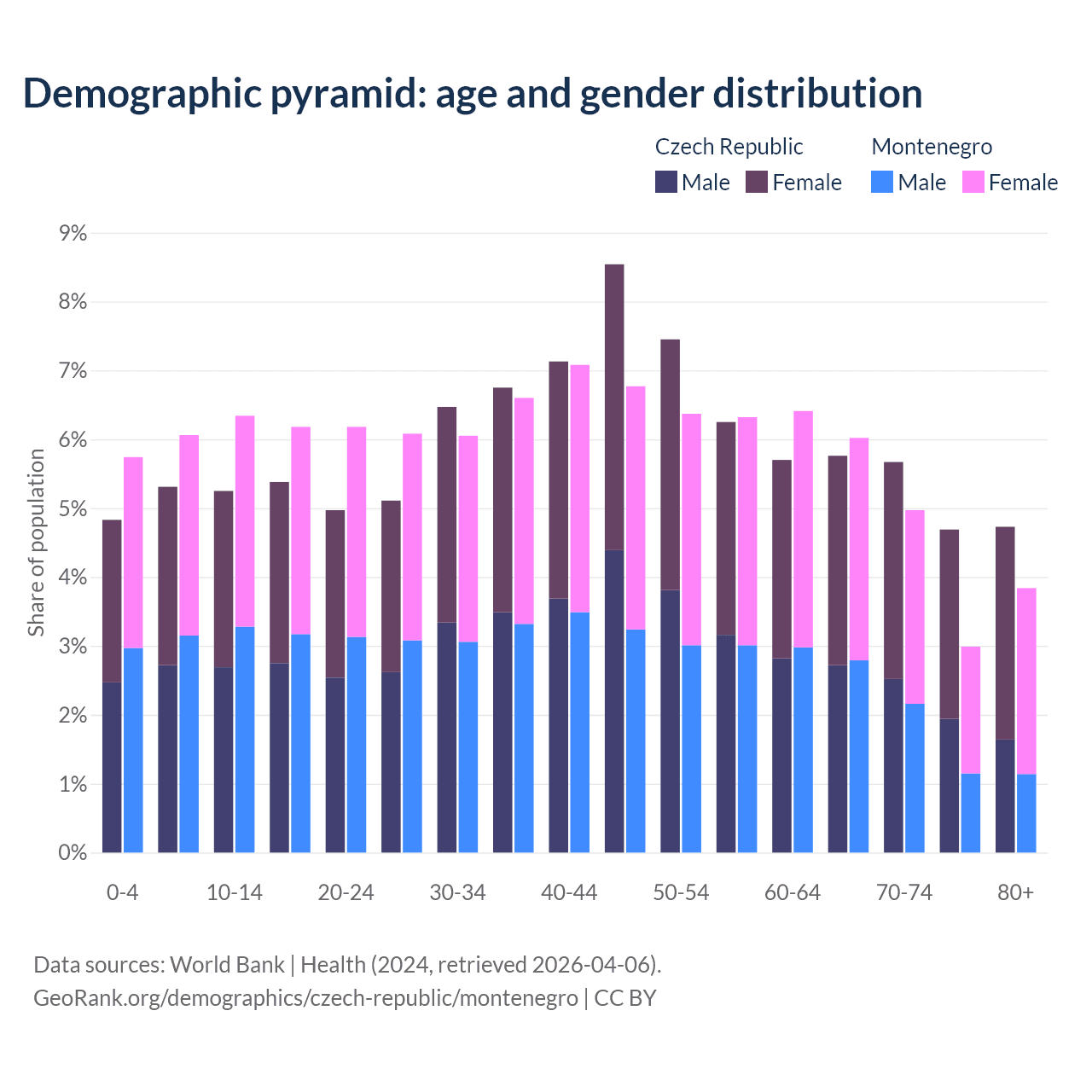 - The Czech Republic is ranked 21/196 by median age (oldest to youngest) vs 45/196 for Montenegro.