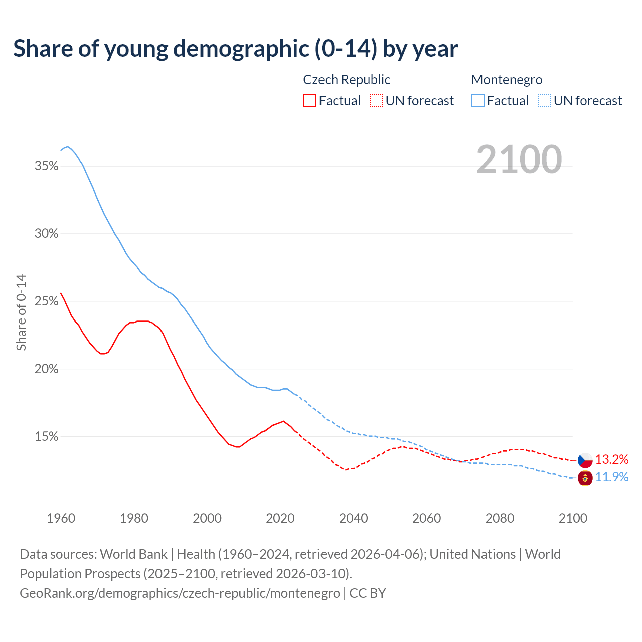 - The share of young demographic (0-15 years old) in the Czech Republic is 15.4% vs 18.1% in Montenegro.