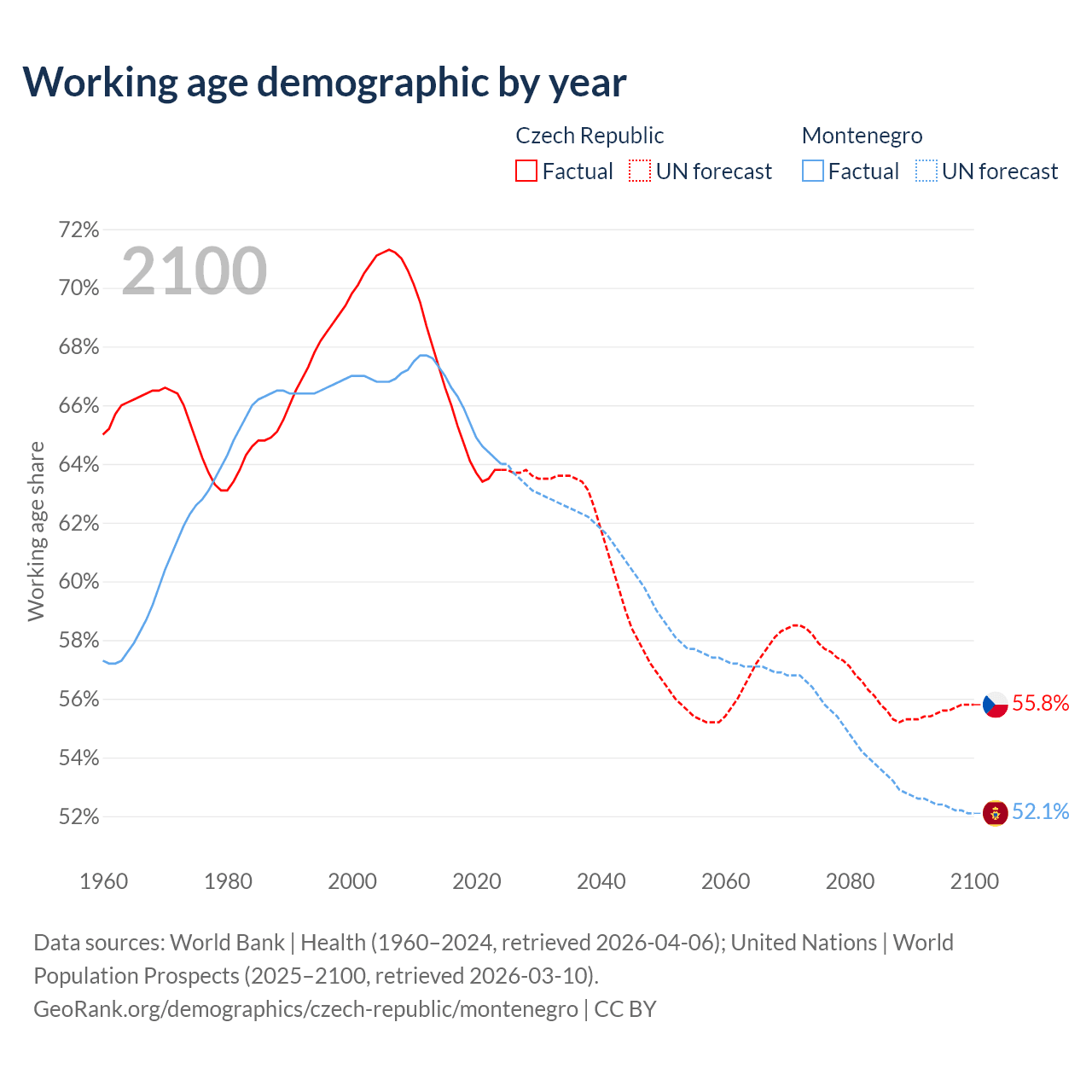- As of 2026, the population of the Czech Republic is 10.6M vs 612K in Montenegro - 17.4 times difference.