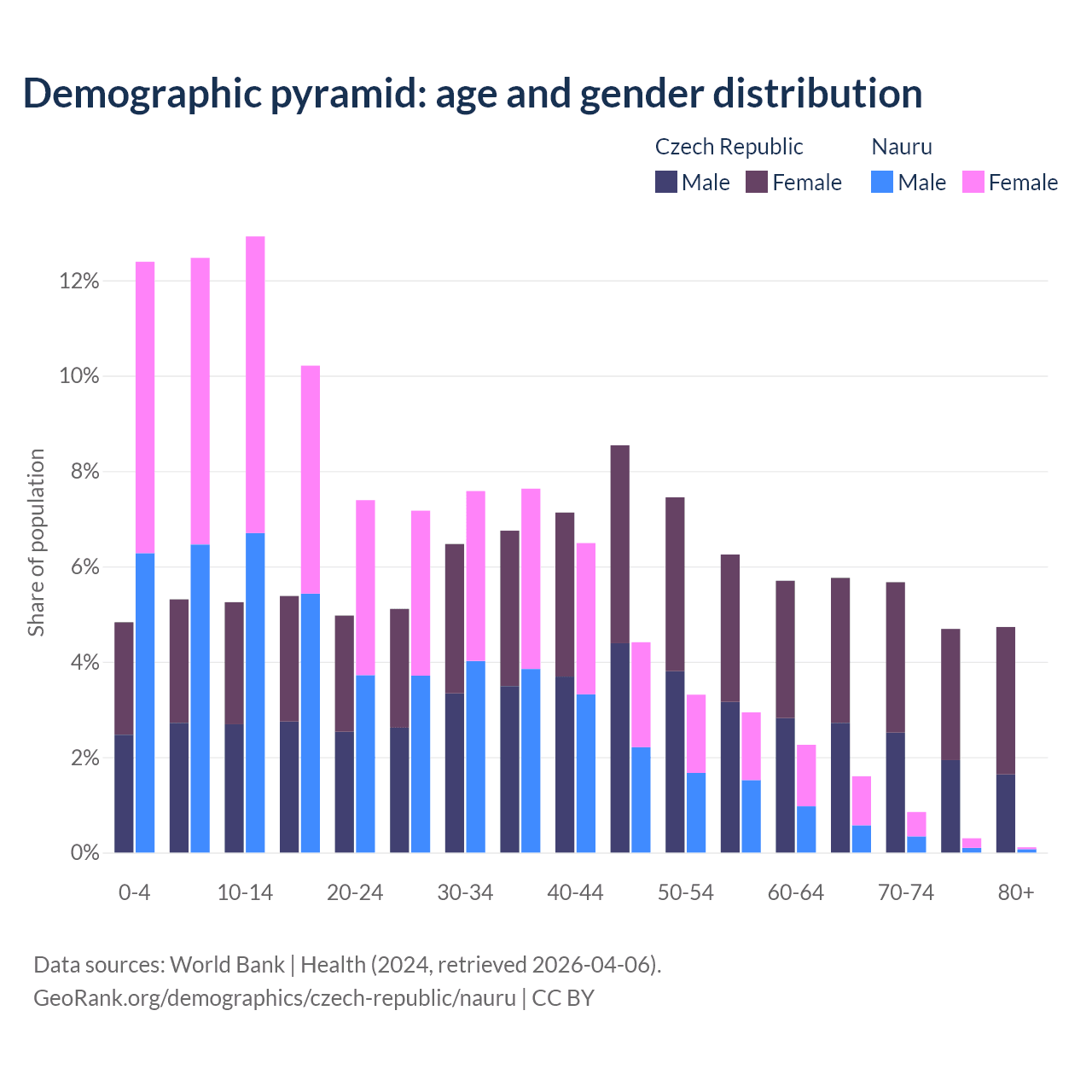 - As of 2026, the population of the Czech Republic is 10.6M vs 12.1K in Nauru - 878 times difference.