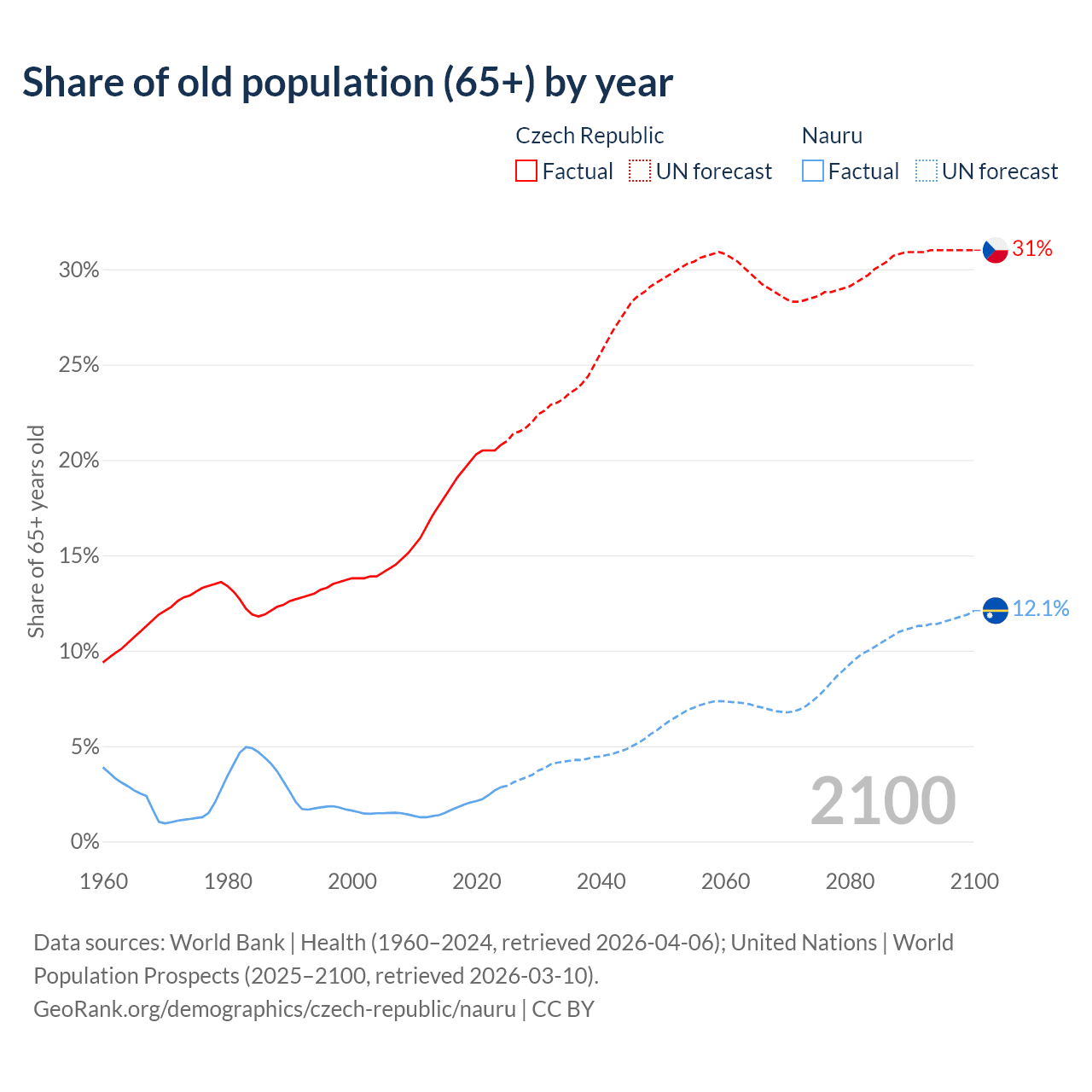 The share of older people aged 65 and over is 20.8% in the Czech Republic and 2.85% in Nauru. Life expectancy in the Czech Republic compared to Nauru .