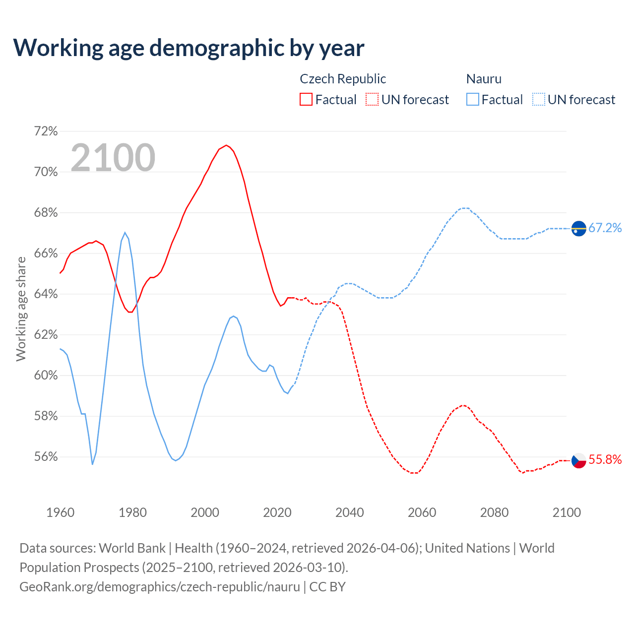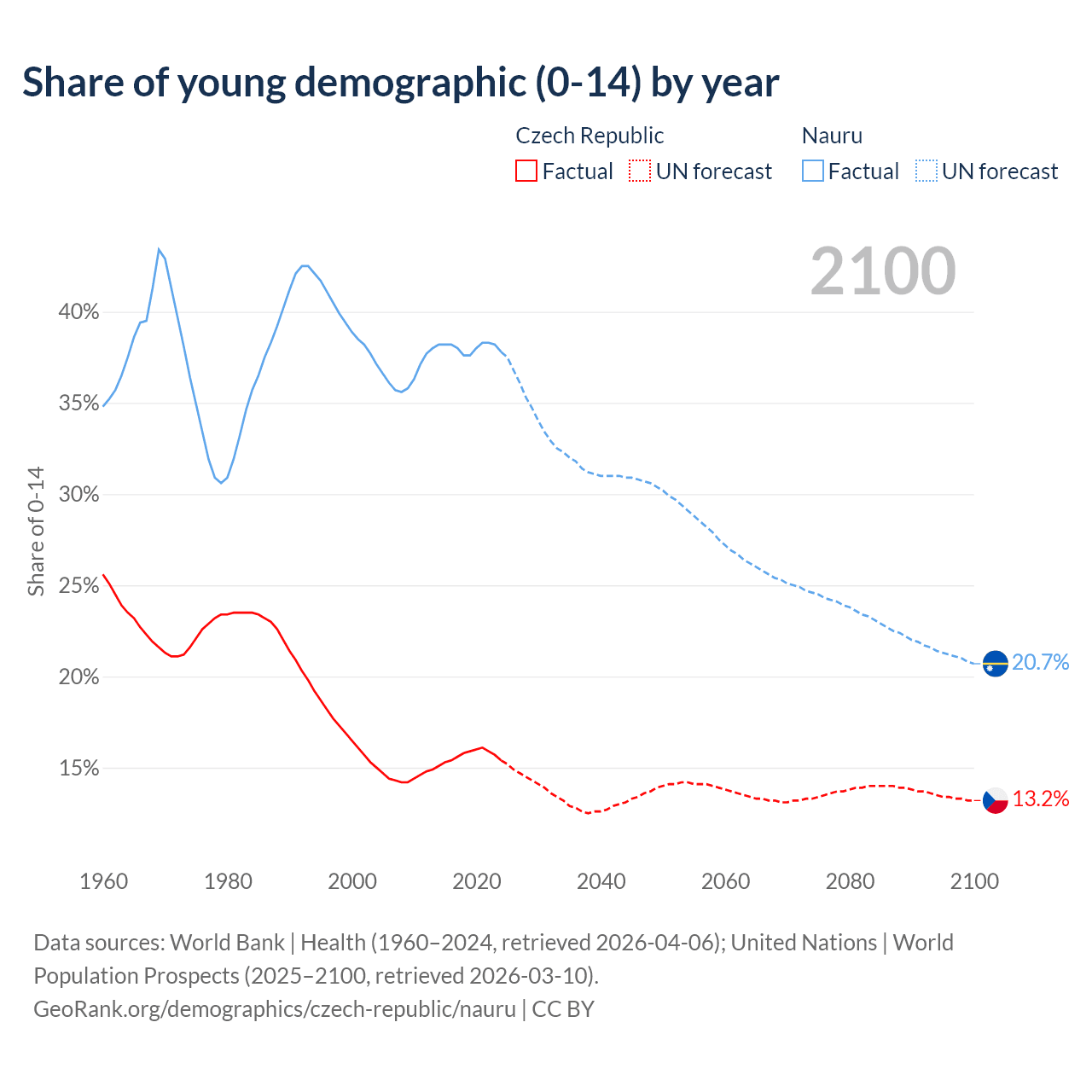 Median age Czech Republic vs Nauru, 1960-2100
