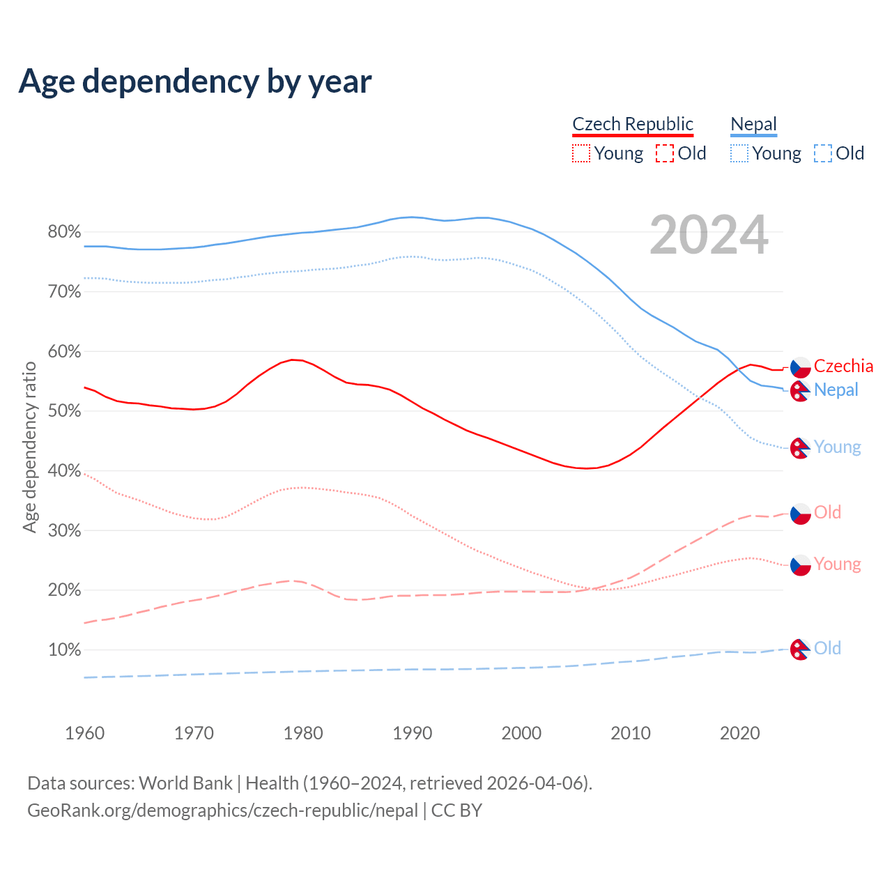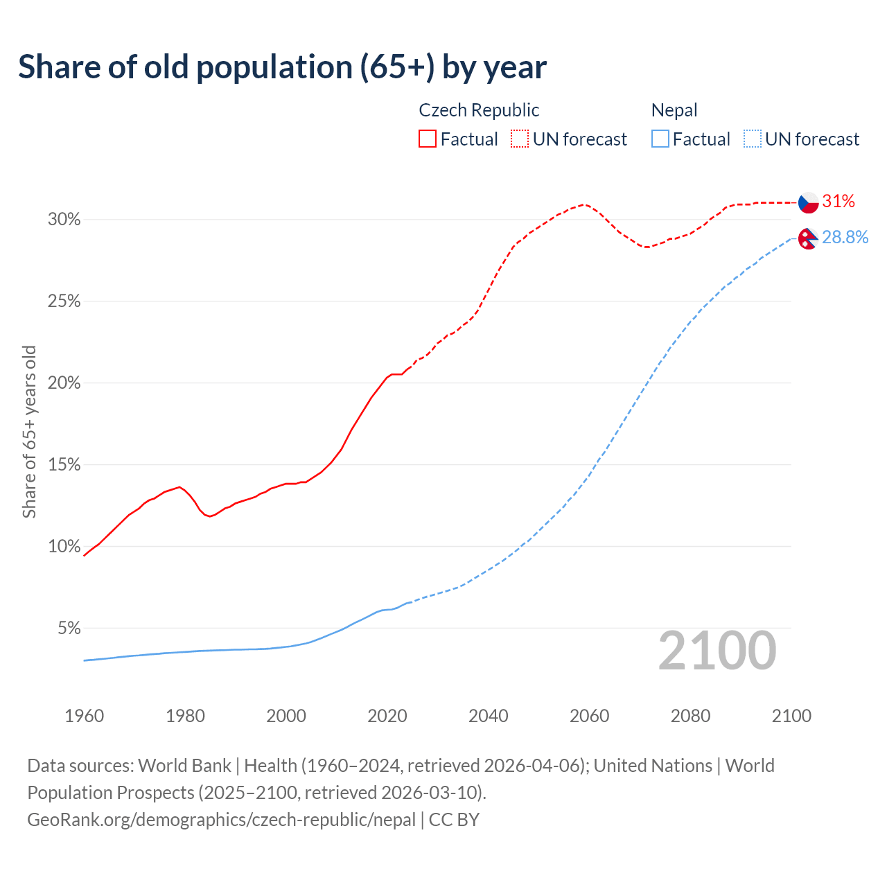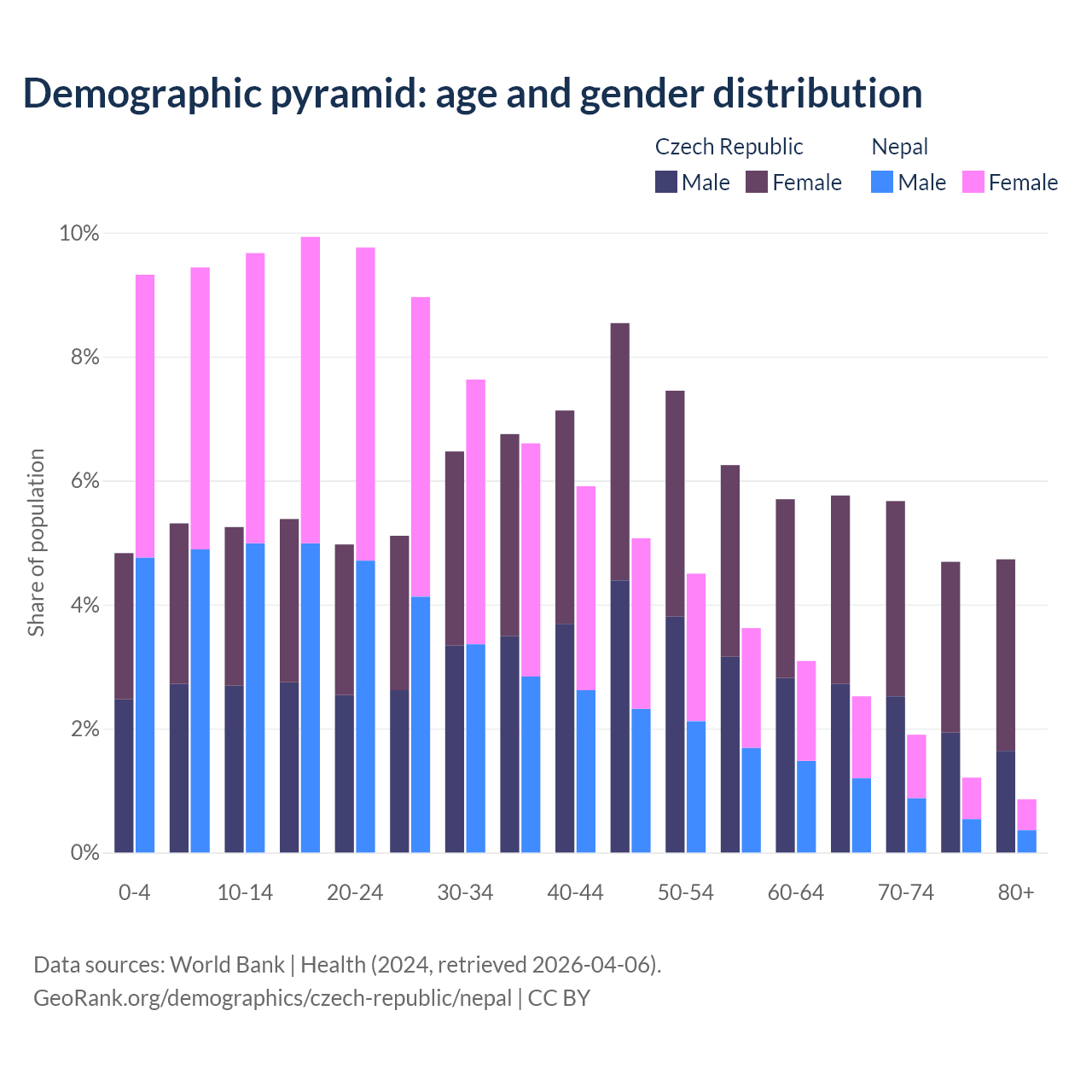 - The share of old-age demographic (65+) in the Czech Republic is 20.8% vs 6.5% in Nepal.
