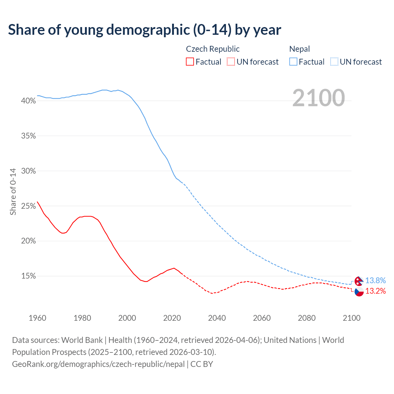 - The share of young demographic (0-15 years old) in the Czech Republic is 15.4% vs 28.4% in Nepal.