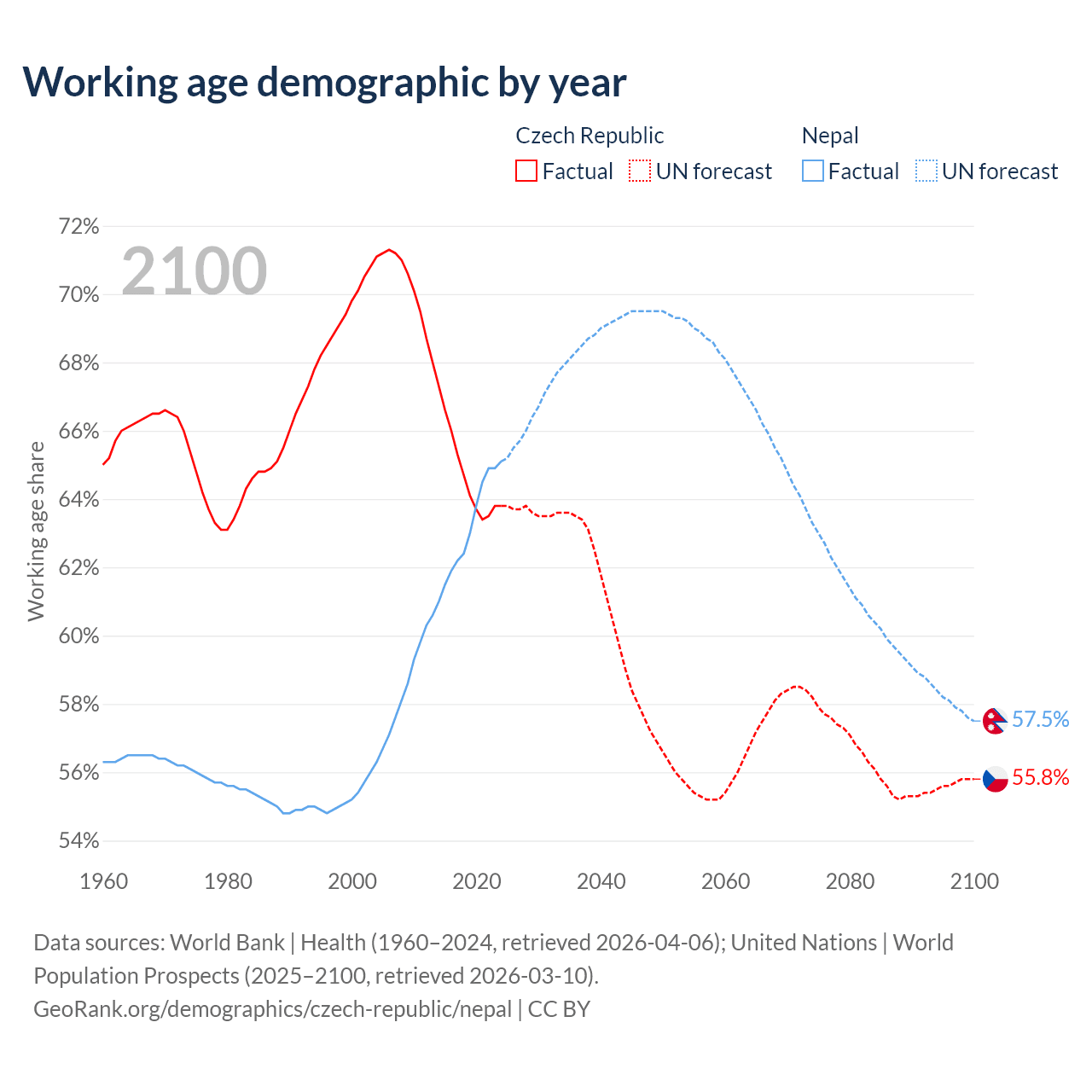 - The Czech Republic has 6.79M working age adults (aged 15-64) vs 19.3M in Nepal.