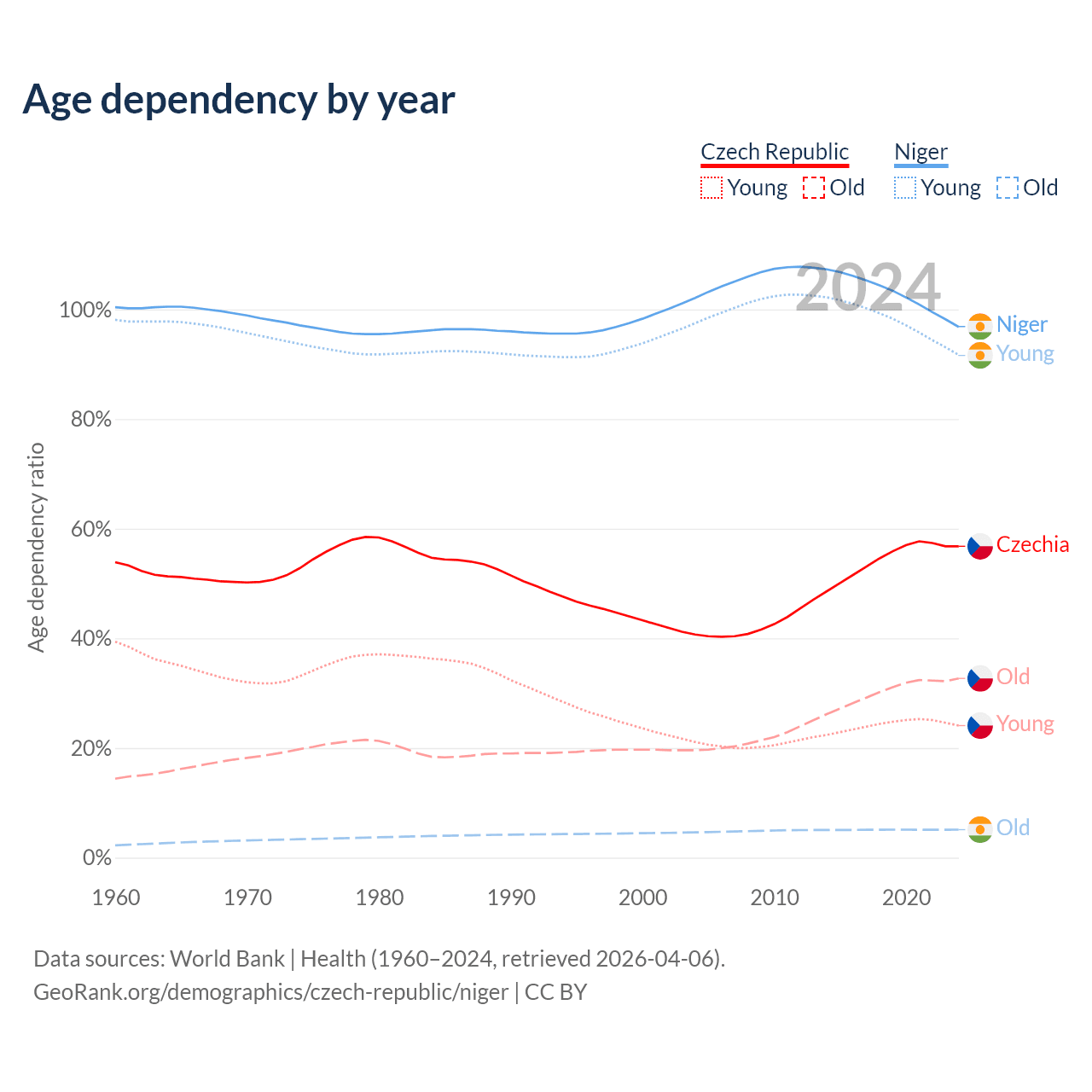 - The Czech Republic is ranked 21/196 by median age (oldest to youngest) vs 195/196 for Niger.