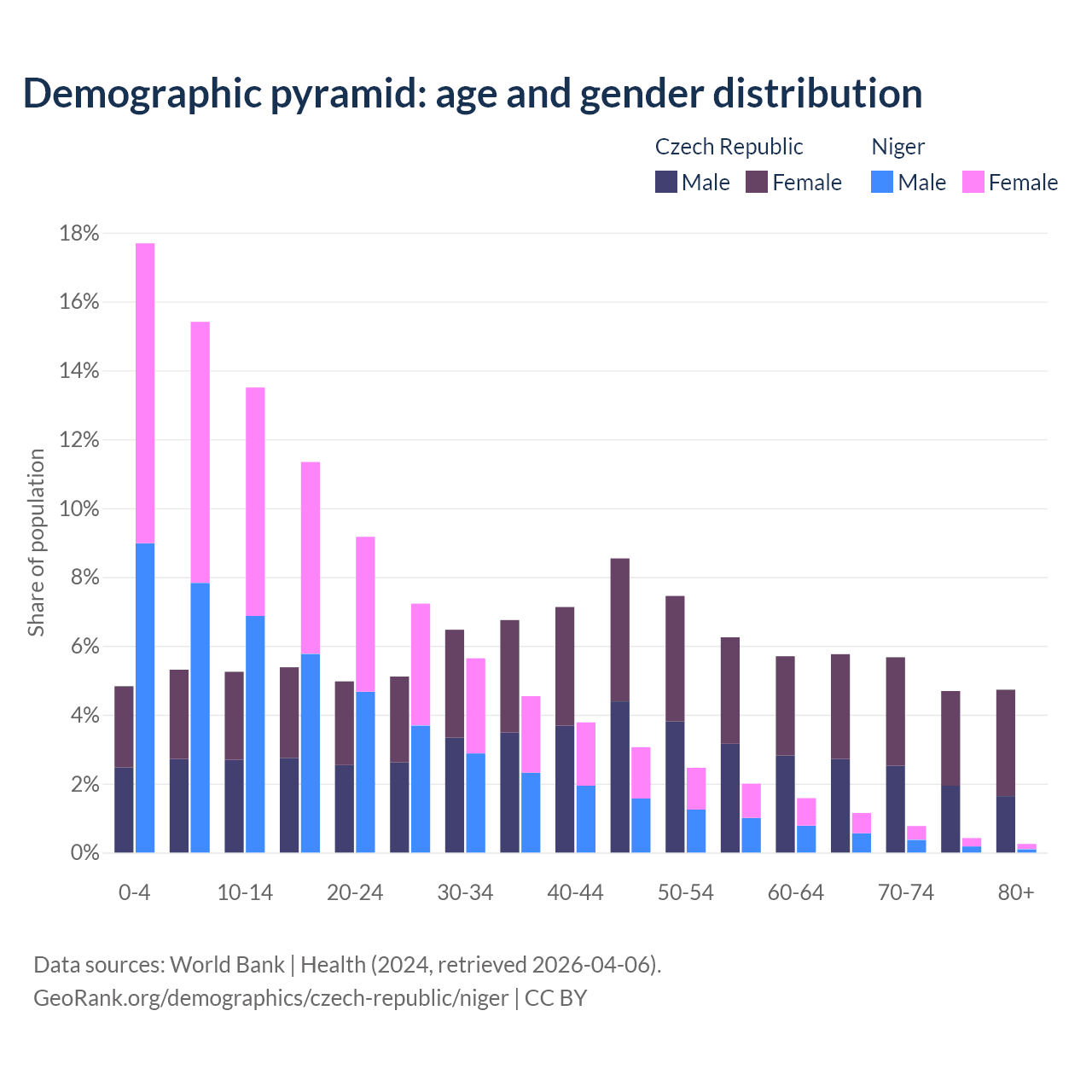 - As of 2026, the population of the Czech Republic is 10.6M vs 29.1M in Niger - 2.73 times difference.