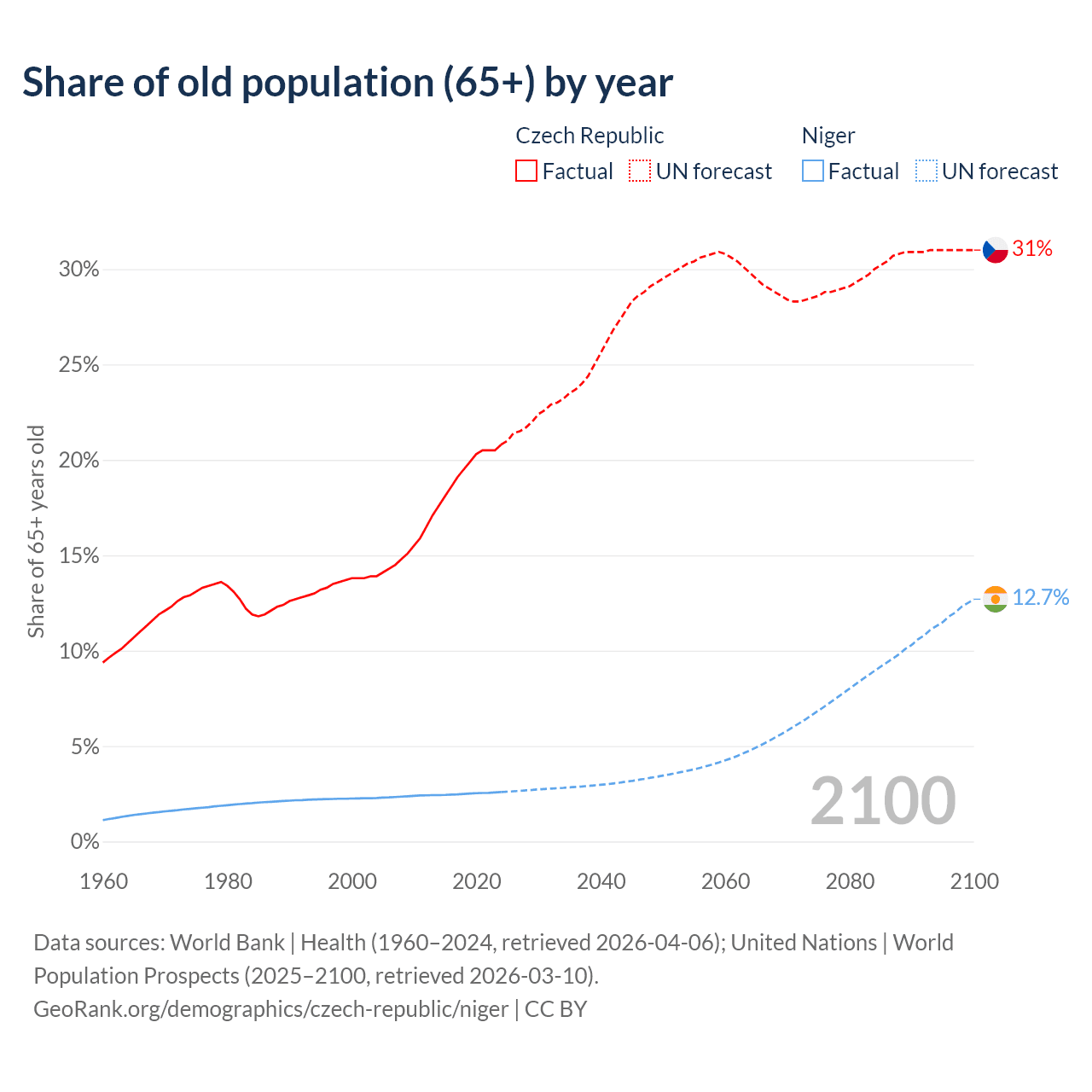 The share of older people aged 65 and over is 20.8% in the Czech Republic and 2.59% in Niger. Life expectancy in the Czech Republic compared to Niger .