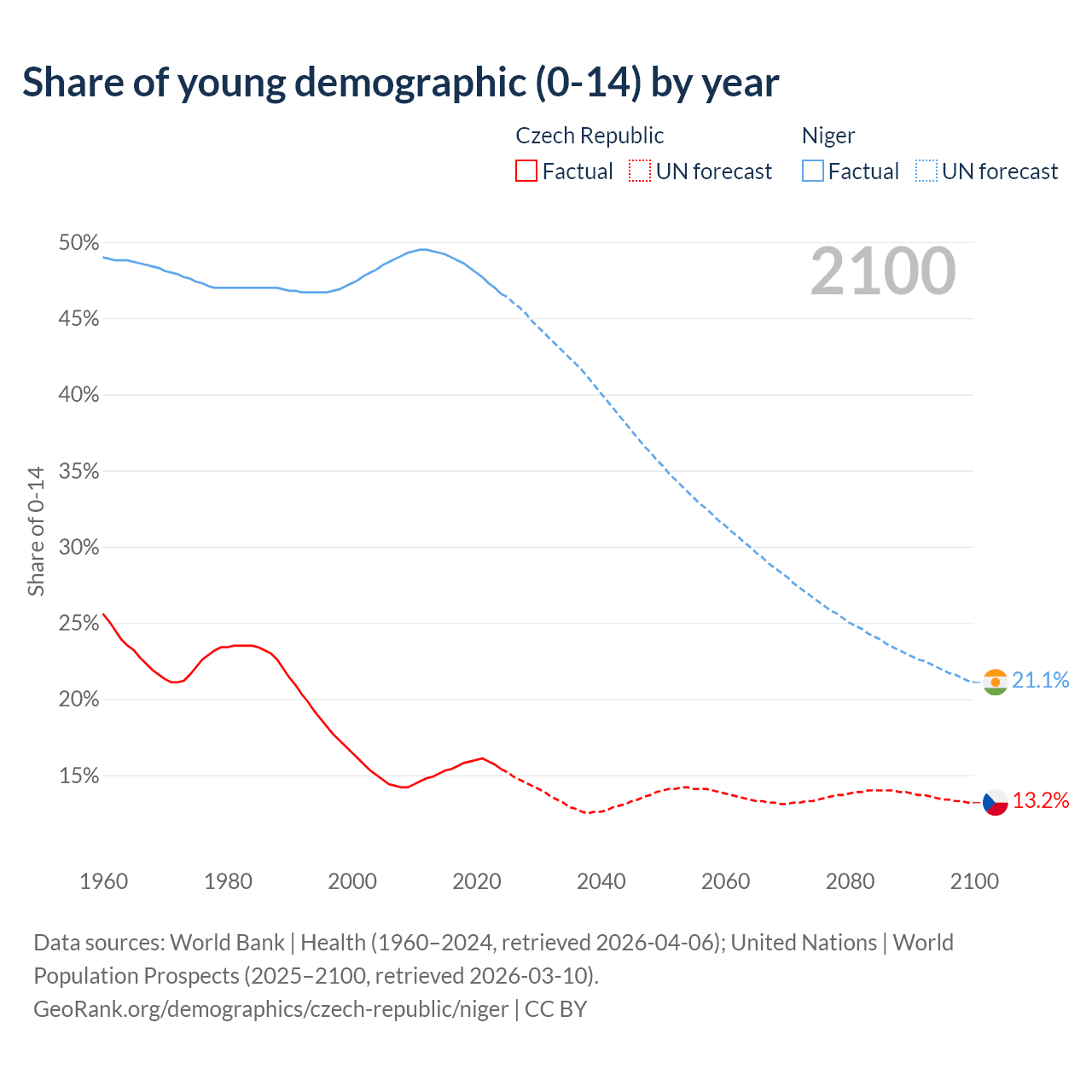 - The share of young demographic (0-15 years old) in the Czech Republic is 15.4% vs 46.6% in Niger.
