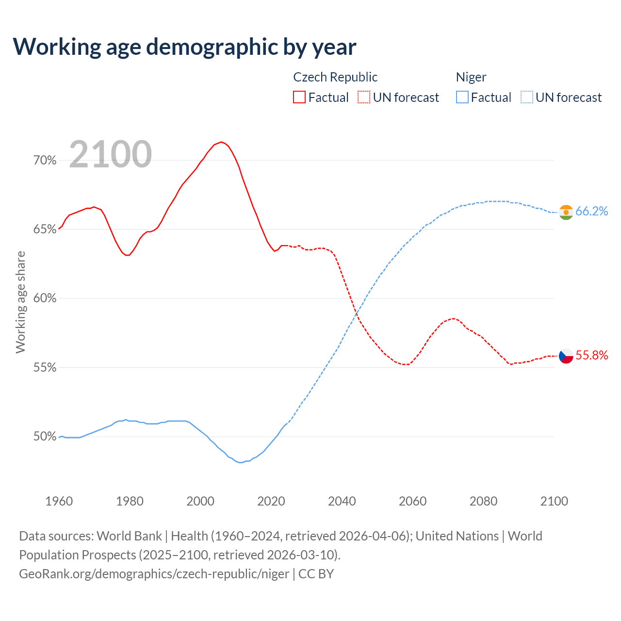 - The Czech Republic has 6.79M working age adults (aged 15-64) vs 14.8M in Niger.