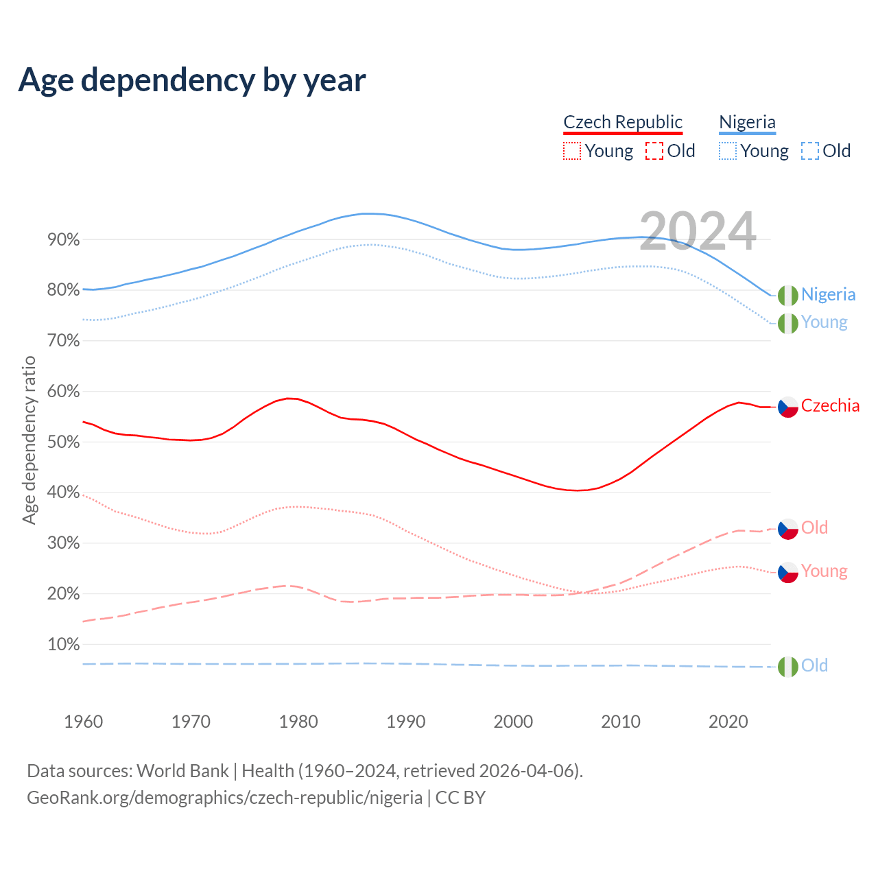 - The share of old-age demographic (65+) in the Czech Republic is 20.8% vs 3.05% in Nigeria.
