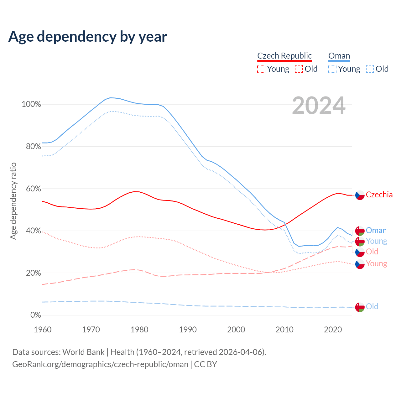 - The share of old-age demographic (65+) in the Czech Republic is 20.8% vs 2.64% in Oman.