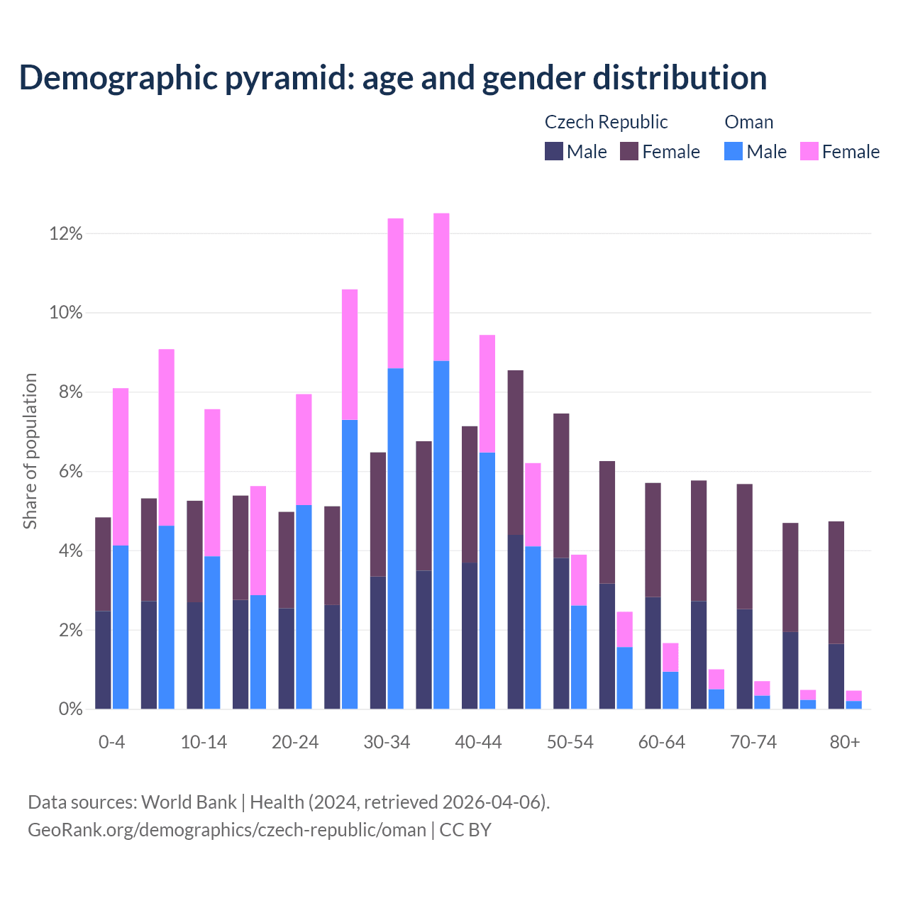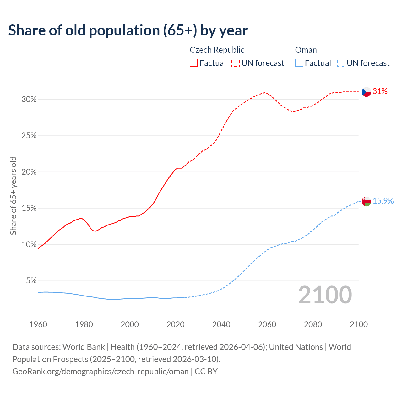 The share of older people aged 65 and over is 20.8% in the Czech Republic and 2.64% in Oman. Life expectancy in the Czech Republic compared to Oman .