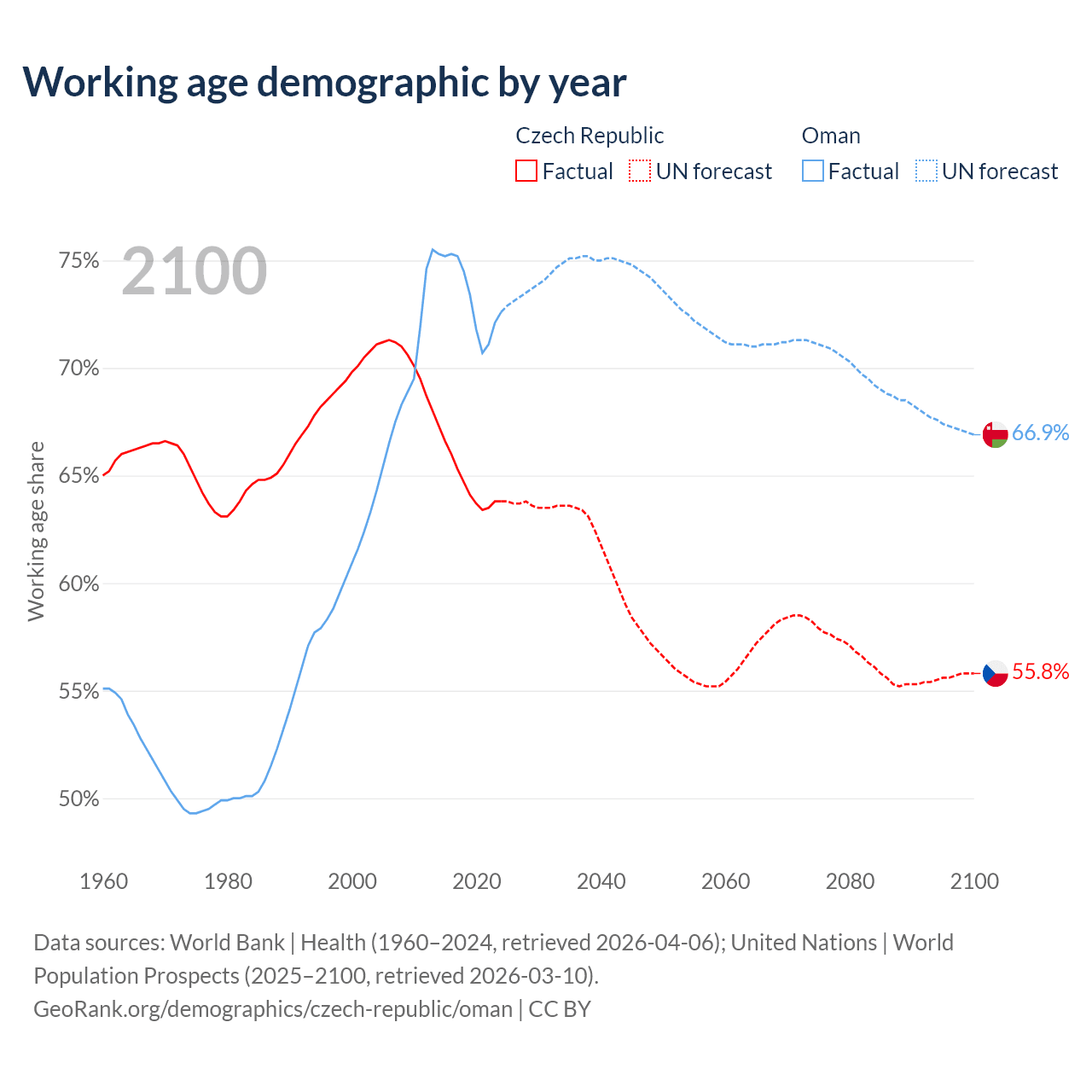 - The Czech Republic has 6.79M working age adults (aged 15-64) vs 4.19M in Oman.