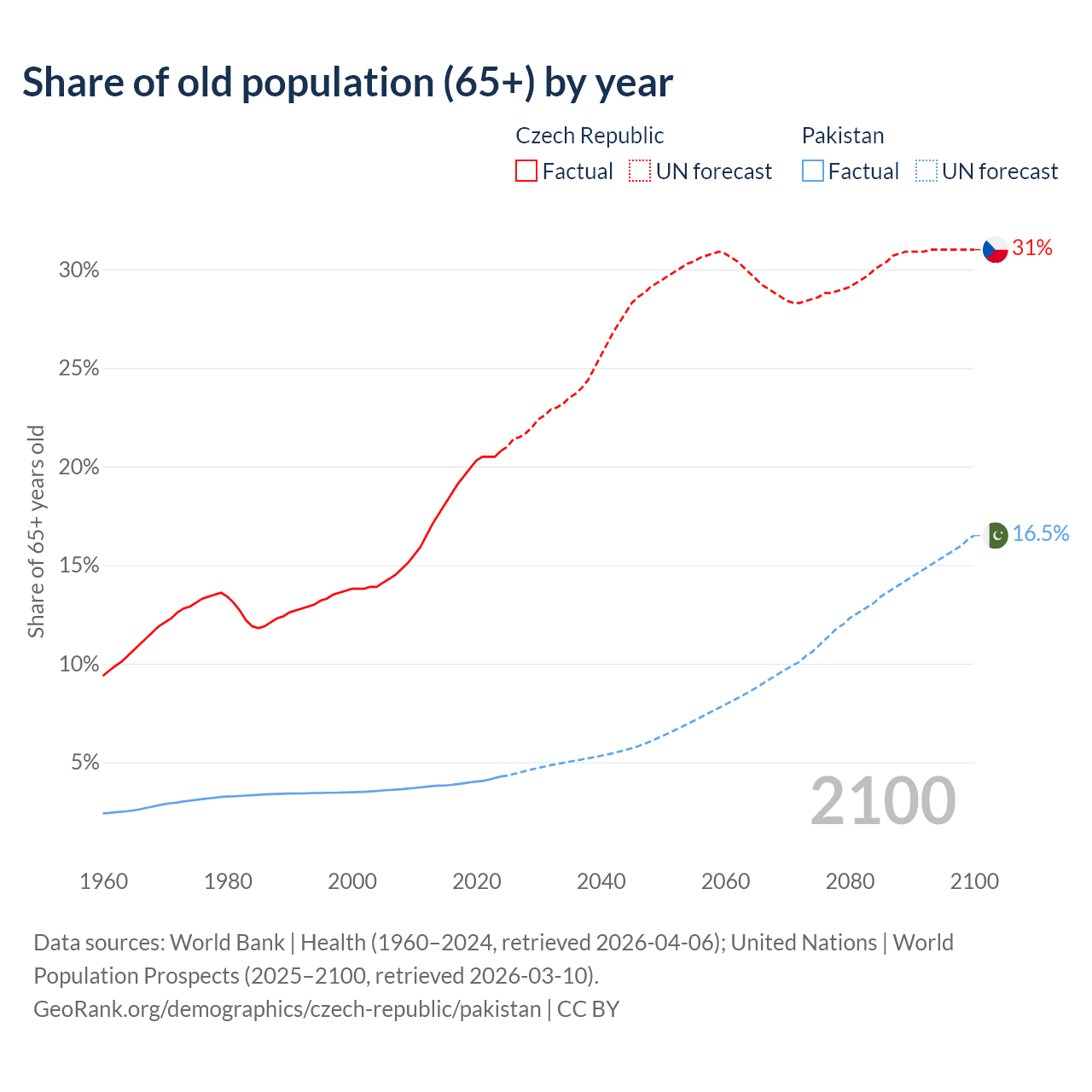 The share of older people aged 65 and over is 20.8% in the Czech Republic and 4.28% in Pakistan. Life expectancy in the Czech Republic compared to Pakistan .