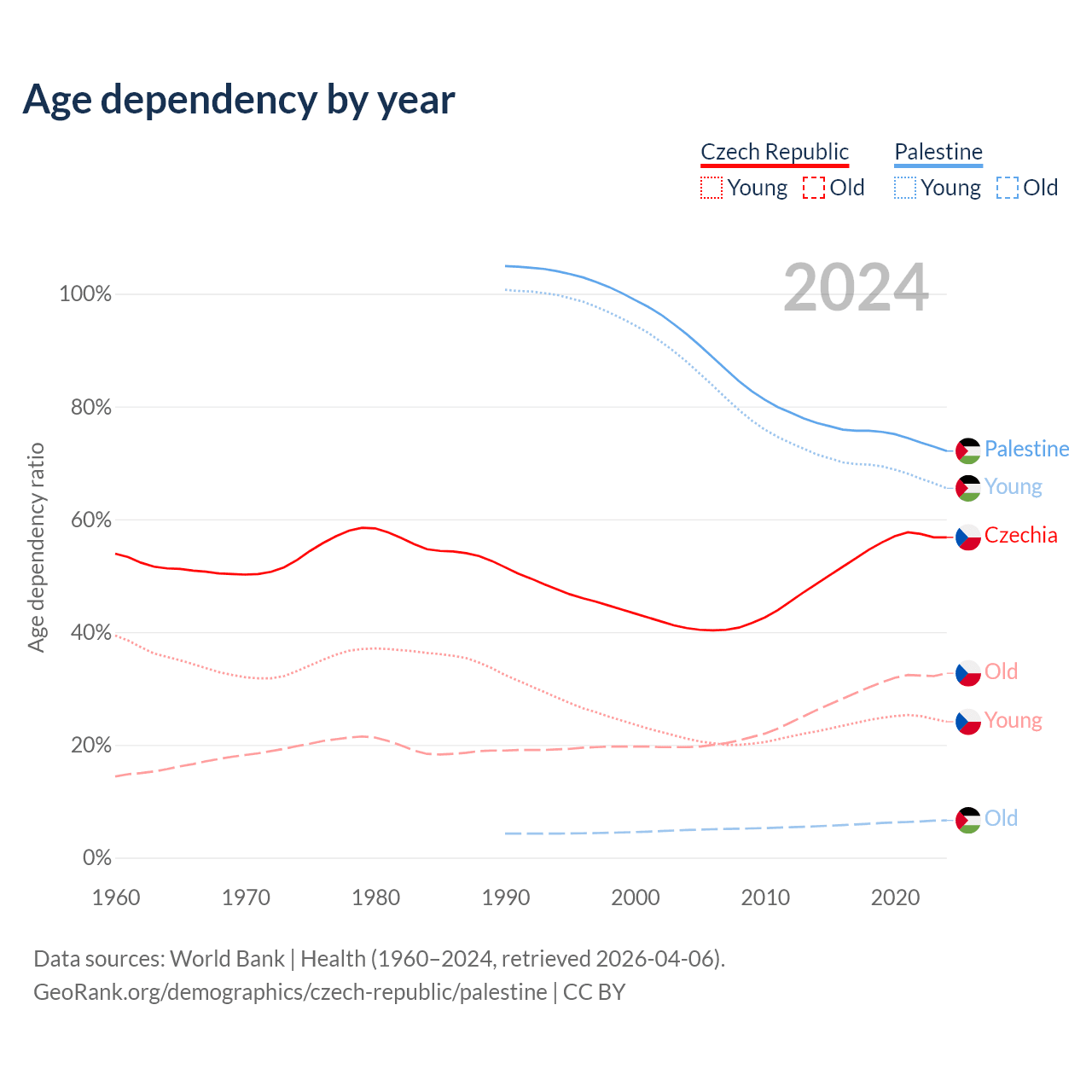 - The Czech Republic is ranked 21/196 by median age (oldest to youngest) vs 157/196 for Palestine.