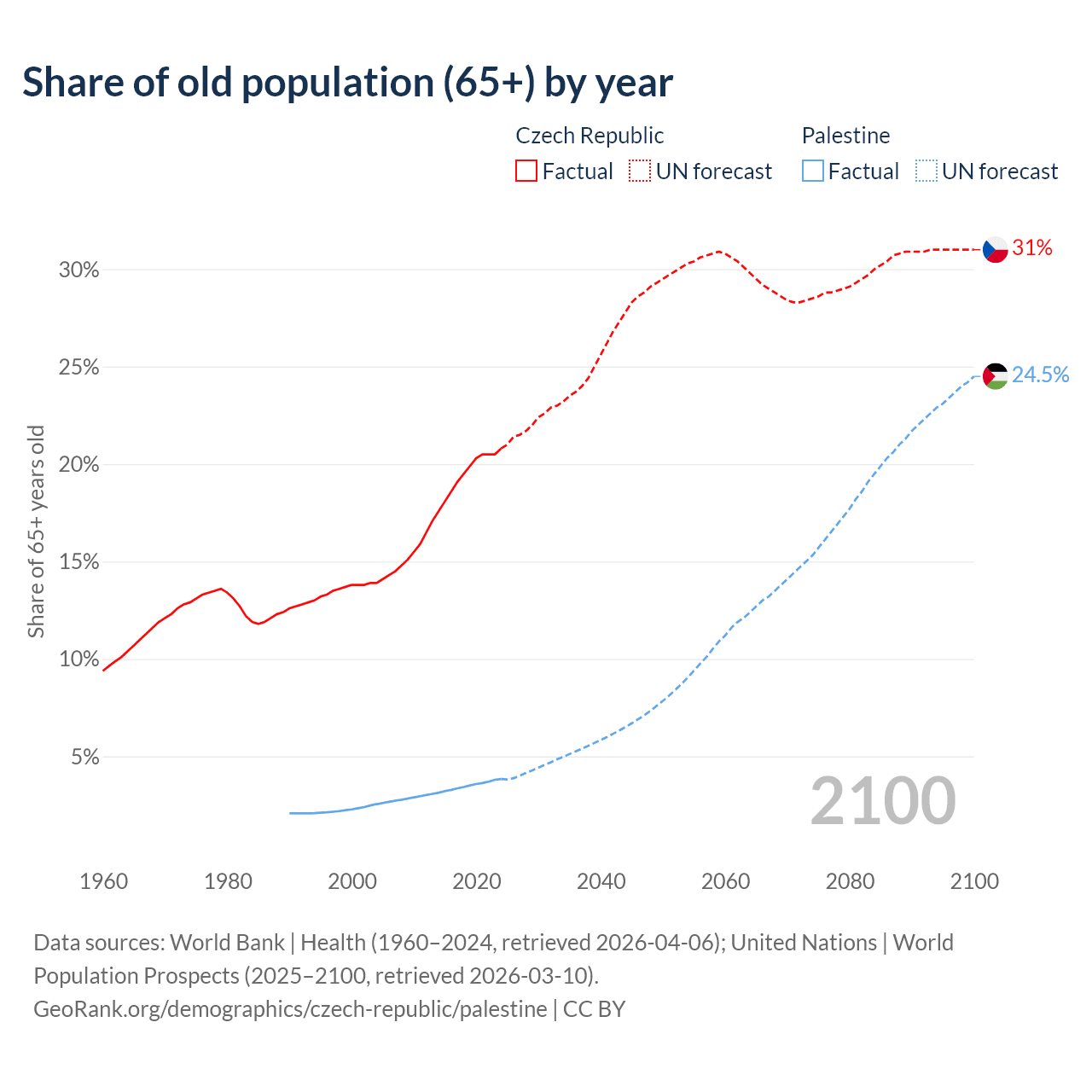 - The share of old-age demographic (65+) in the Czech Republic is 20.8% vs 3.84% in Palestine.