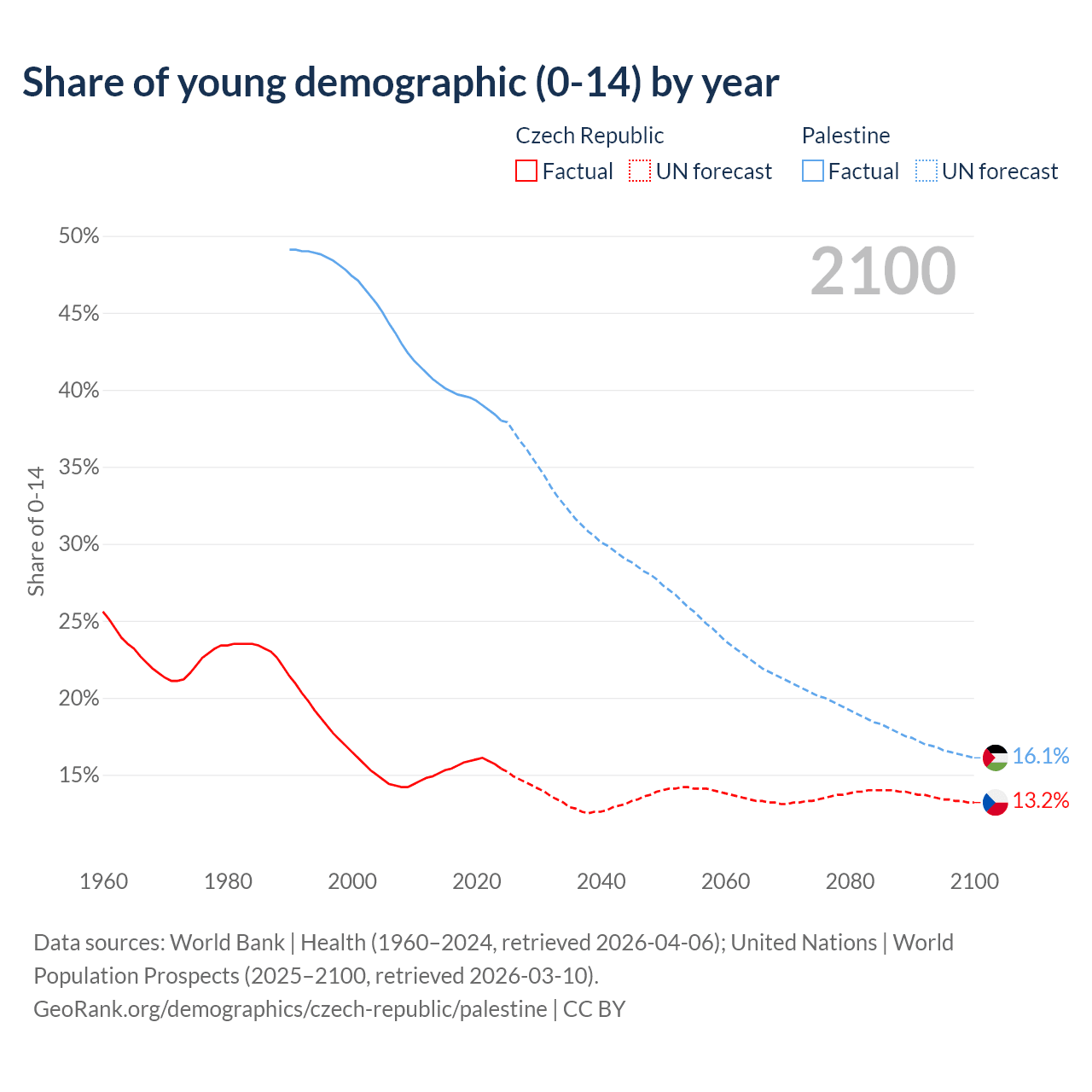 - The share of young demographic (0-15 years old) in the Czech Republic is 15.4% vs 38% in Palestine.