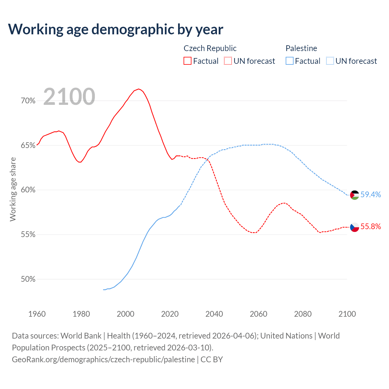 - The Czech Republic has 6.79M working age adults (aged 15-64) vs 3.2M in Palestine.