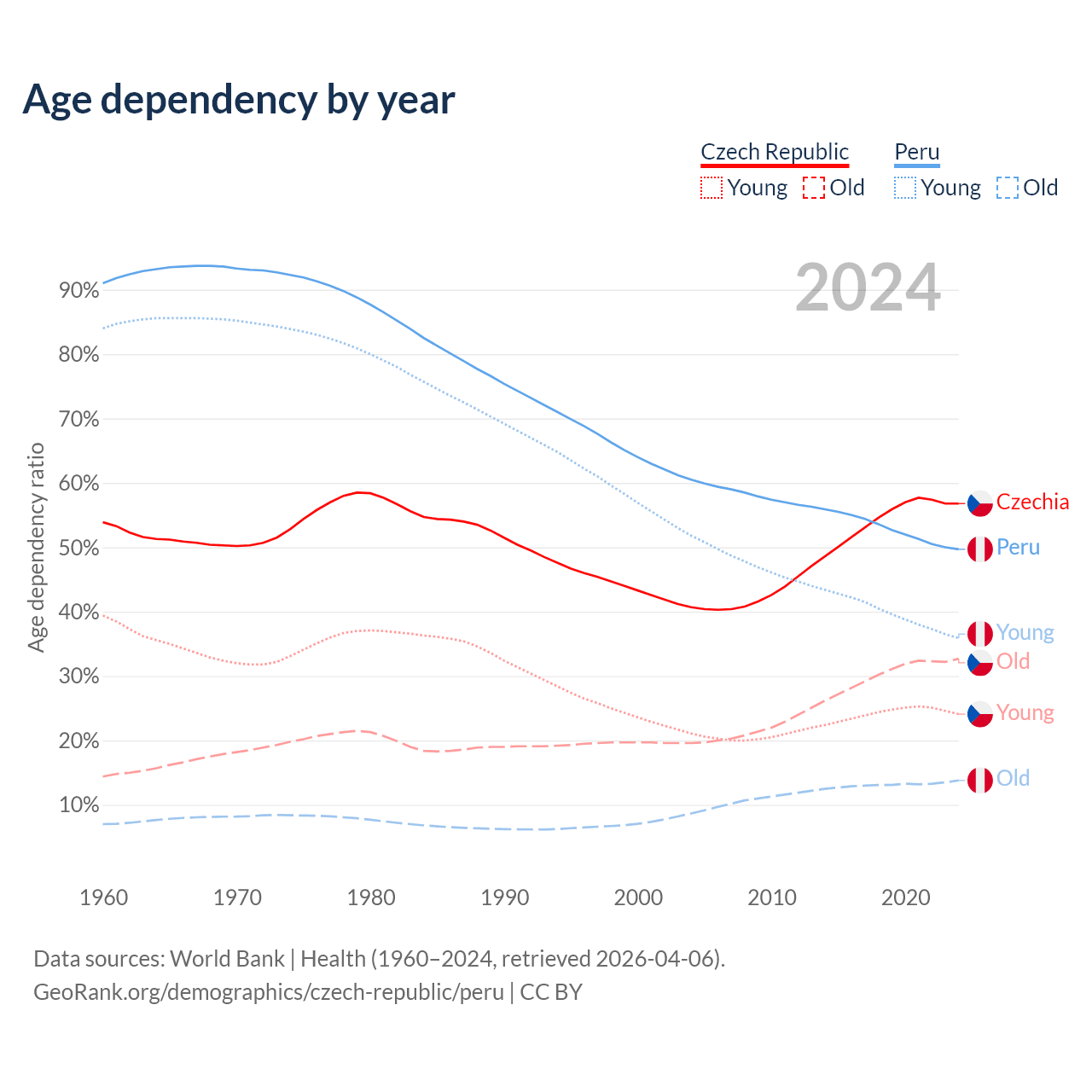- The Czech Republic is ranked 21/196 by median age (oldest to youngest) vs 97/196 for Peru.