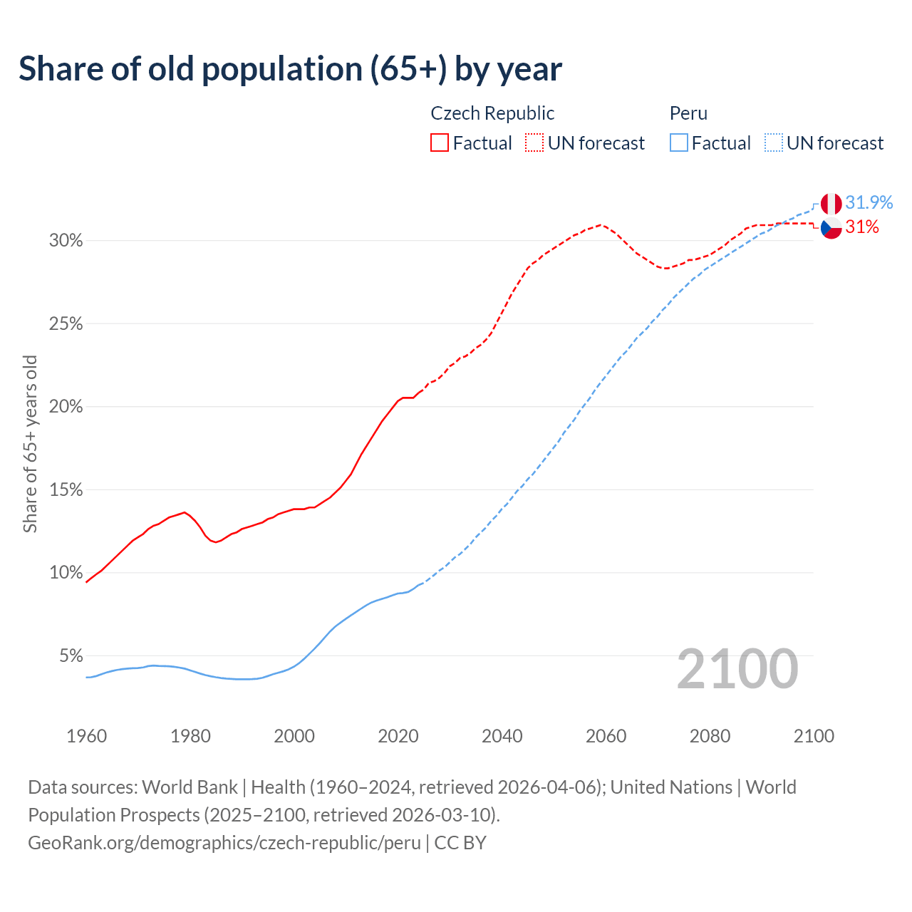 The share of older people aged 65 and over is 20.8% in the Czech Republic and 9.23% in Peru. Life expectancy in the Czech Republic compared to Peru .
