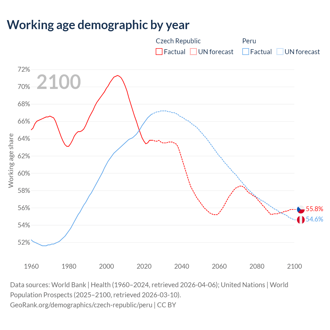 Median age Czech Republic vs Peru, 1960-2100