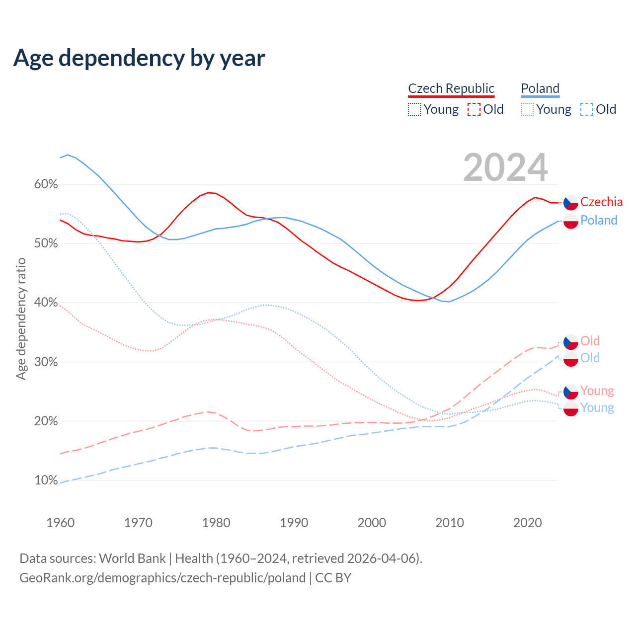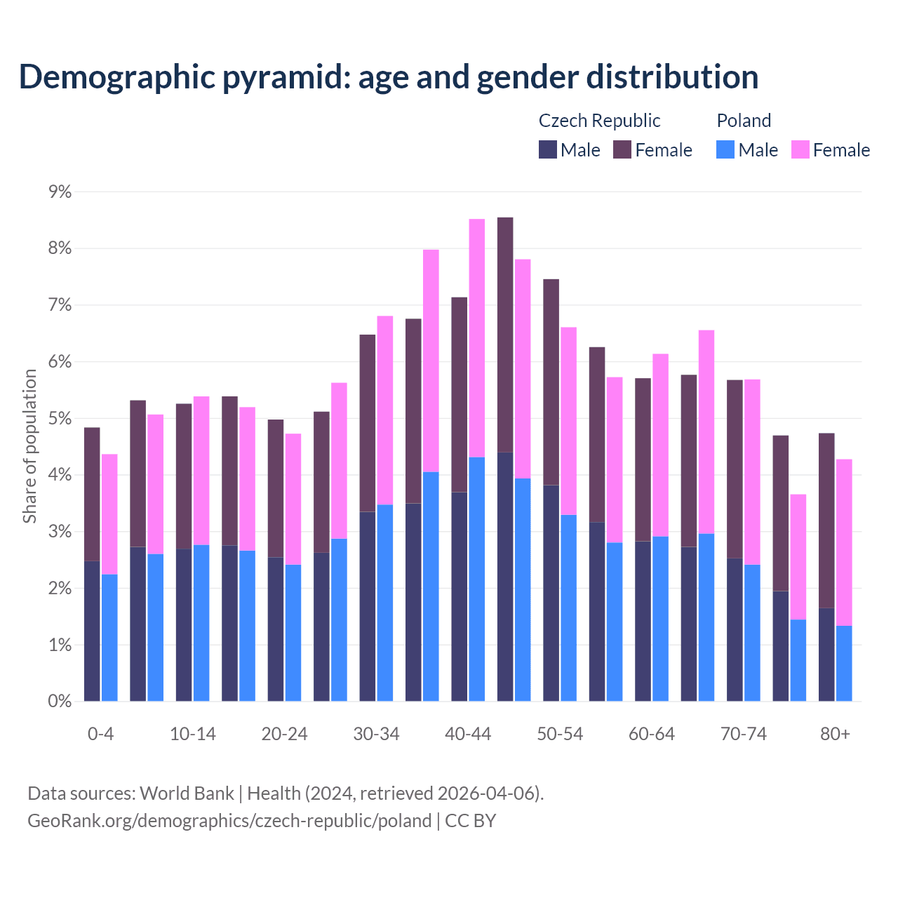 - The Czech Republic is ranked 21/196 by median age (oldest to youngest) vs 30/196 for Poland.