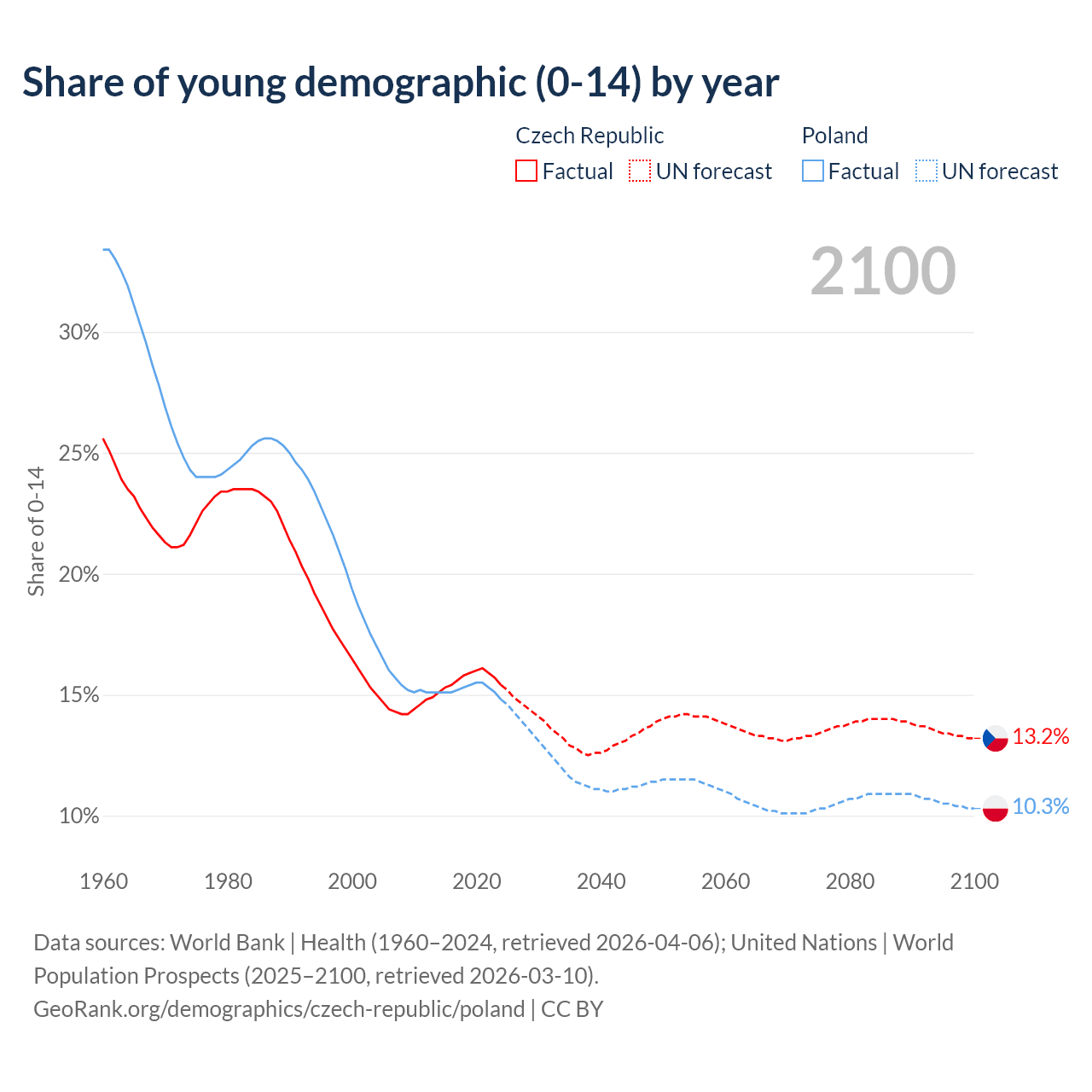 - The share of young demographic (0-15 years old) in the Czech Republic is 15.4% vs 14.8% in Poland.