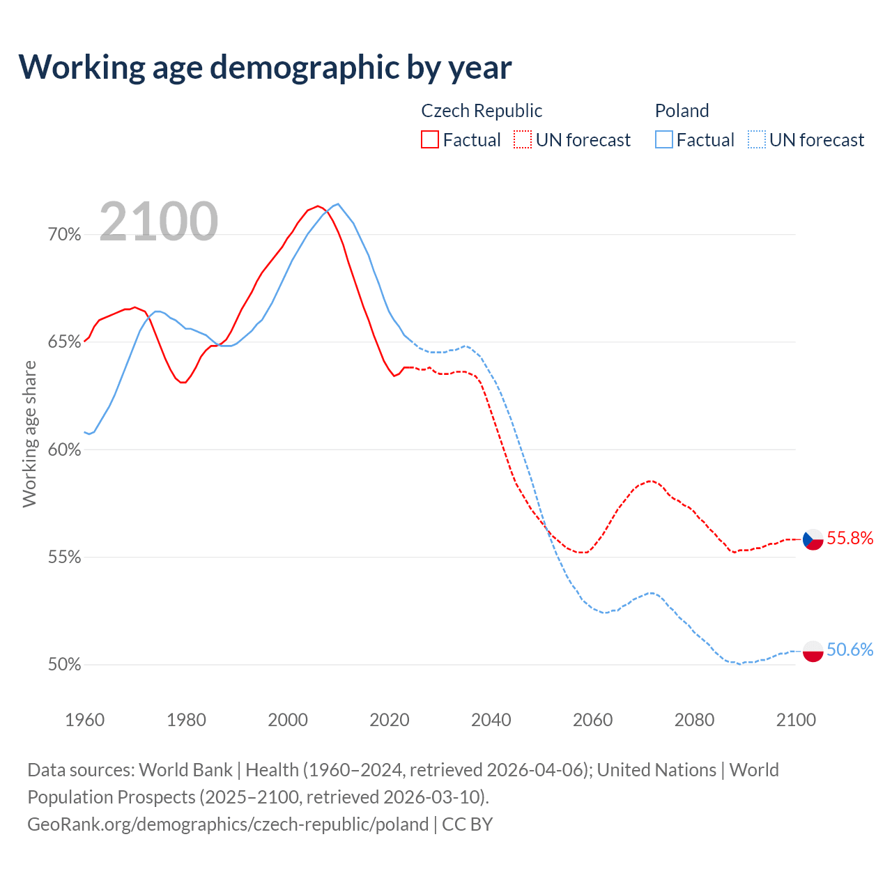 - The Czech Republic has 6.79M working age adults (aged 15-64) vs 23.3M in Poland.
