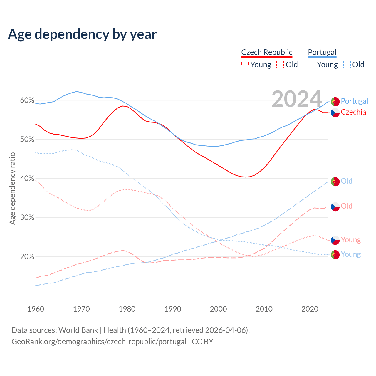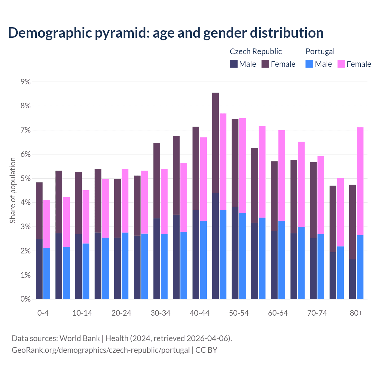 - The Czech Republic is ranked 21/196 by median age (oldest to youngest) vs 5/196 for Portugal.